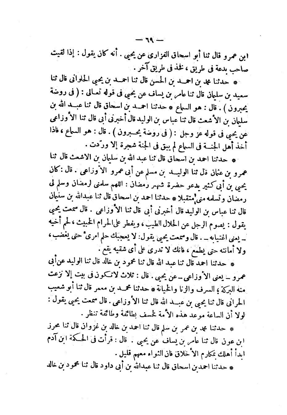 حَدَّثَنَا أَحْمَدُ بْنُ إِسْحَاقَ، قَالَ: ثَنَا عَبْدُ اللهِ بْنُ سُلَيْمَانَ بْنِ الْأَشْعَثِ، قَالَ: ثَنَا عَبَّاسُ بْنُ الْوَلِيدِ، قَالَ: أَخْبَرَنِي أَبِي، قَالَ: ثَنَا الْأَوْزَاعِيُّ، عَنْ يَحْيَى، " فِي قَوْلِهِ عَزَّ وَجَلَّ {§فِي رَوْضَةٍ يُحْبَرُونَ} [الروم: 15] قَالَ: هُوَ السَّمَاعُ، فَإِذَا أَخَذَ أَهْلُ الْجَنَّةِ فِي السَّمَاعِ لَمْ يَبْقَ فِي الْجَنَّةِ شَجَرَةٌ إِلَّا وَرَدَتْ "
