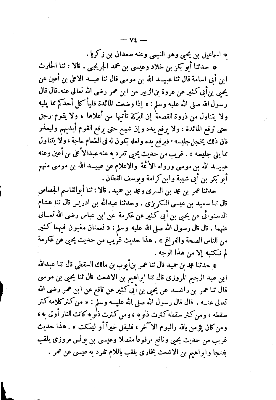 حَدَّثَنَا أَبُو بَكْرِ بْنُ خَلَّادٍ، وَعِيسَى بْنُ مُحَمَّدٍ الْجُرَيْجِي، قَالَا: ثَنَا الْحَارِثُ بْنُ أَبِي أُسَامَةُ، قَالَ: ثَنَا عُبَيْدُ اللهِ بْنُ مُوسَى، قَالَ: ثَنَا عَبْدُ الْأَعْلَى بْنُ أَعْيَنَ، عَنْ يَحْيَى بْنِ أَبِي كَثِيرٍ، عَنْ عُرْوَةَ بْنِ الزُّبَيْرِ عَنِ ابْنِ عُمَرَ، رَضِيَ اللهُ تَعَالَى عَنْهُ قَالَ: قَالَ رَسُولُ اللهِ صَلَّى اللهُ عَلَيْهِ وَسَلَّمَ: «§إِذَا وُضِعَتِ الْمَائِدَةُ فَلْيَأْكُلْ أَحَدُكُمْ مِمَّا يَلِيهِ، وَلَا يَتَنَاوَلْ مِنْ ذِرْوَةِ الْقَصْعَةِ، إِنَّ الْبَرَكَةَ تَأْتِيهَا مِنْ أَعْلَاهَا، وَلَا يَقُومُ رَجُلٌ حَتَّى تُرْفَعَ الْمَائِدَةُ، وَلَا يَرْفَعُ يَدَهُ، وَإِنْ شَبِعَ حَتَّى يَرْفَعَ الْقَوْمُ أَيْدِيَهُمْ، وَلْيَعْذِرْ فَإِنَّ ذَلِكَ يُخْجِلُ جَلِيسَهُ فَيَرْفَعُ يَدَهُ، وَلَعَلَّهُ يَكُونُ لَهُ فِي الطَّعَامِ حَاجَةٌ، وَلَا يَتَنَاوَلْ مِمَّا يَلِي جَلِيسَهُ» غَرِيبٌ مِنْ حَدِيثِ يَحْيَى، تَفَرَّدَ بِهِ عَنْهُ عَبْدُ الْأَعْلَى بْنُ أَعْيَنَ، وَعَنْهُ عُبَيْدُ اللهِ بْنُ مُوسَى، وَرَوَاهُ الْأَئِمَّةُ وَالْأَعْلَامُ، عَنْ عُبَيْدِ اللهِ بْنِ مُوسَى مِنْهُمْ أَبُو بَكْرِ بْنُ أَبِي شَيْبَةَ، وَابْنُ كَرَامَةَ وَيُوسُفُ الْقَطَّانُ
