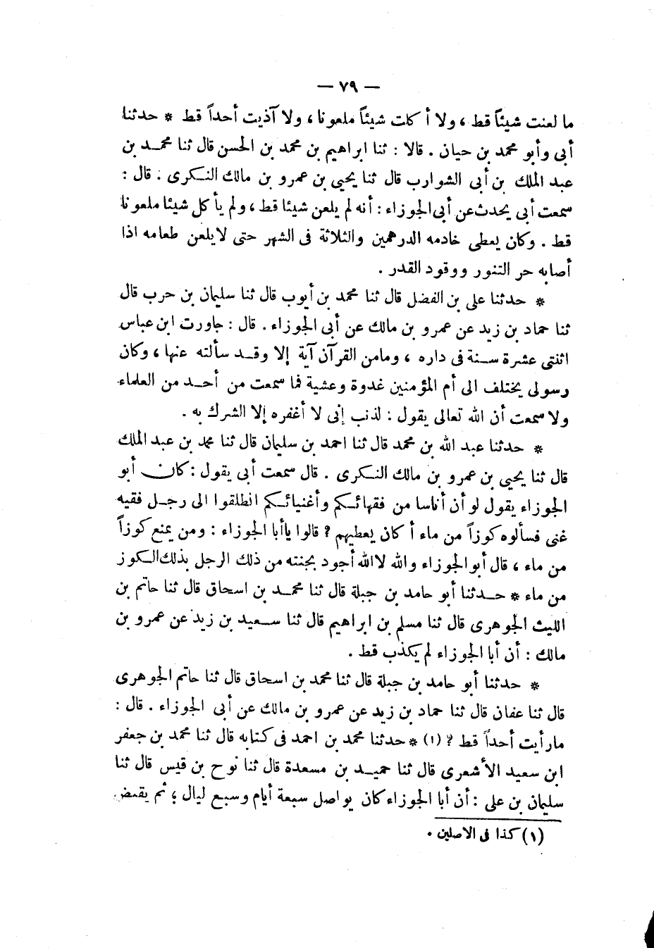 حَدَّثَنَا أَبُو حَامِدِ بْنُ جَبَلَةَ، قَالَ: ثَنَا مُحَمَّدُ بْنُ إِسْحَاقَ، قَالَ: ثَنَا حَاتِمُ بْنُ اللَّيْثِ الْجَوْهَرِيُّ، قَالَ: ثَنَا مُسْلِمُ بْنُ إِبْرَاهِيمَ، قَالَ: ثَنَا سَعِيدُ بْنُ زَيْدٍ عَنْ عَمْرِو بْنِ مَالِكٍ أَنَّ §أَبَا الْجَوْزَاءِ لَمْ يَكْذِبْ قَطُّ "