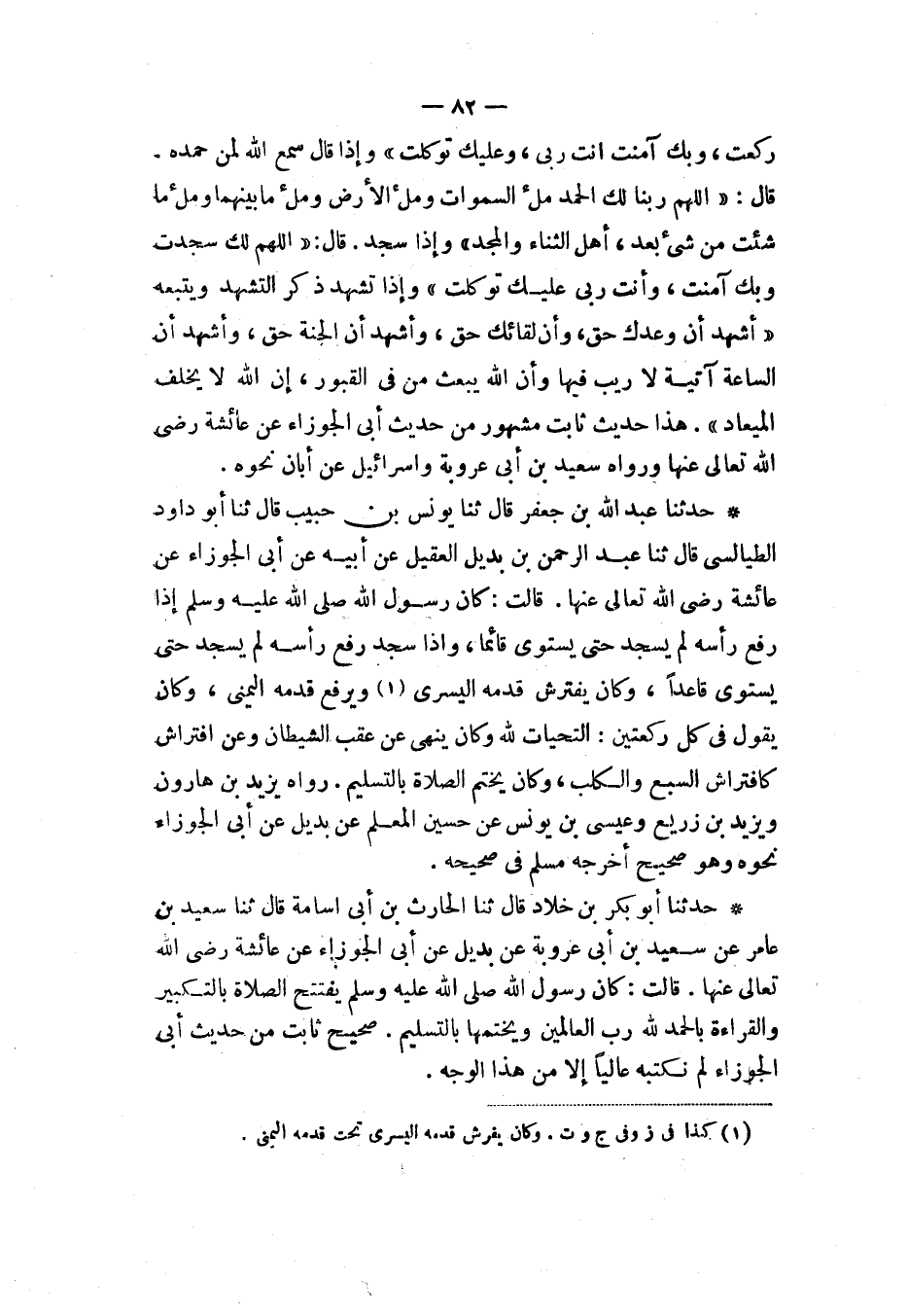 حَدَّثَنَا عَبْدُ اللهِ بْنُ جَعْفَرٍ، قَالَ: ثَنَا يُونُسُ بْنُ حَبِيبِ، قَالَ: ثَنَا أَبُو دَاوُدَ الطَّيَالِسِيُّ، قَالَ: ثَنَا عَبْدُ الرَّحْمَنِ بْنُ بُدَيْلٍ الْعَقِيلُ، عَنْ أَبِيهِ، عَنْ أَبِي الْجَوْزَاءِ، عَنْ عَائِشَةَ، رَضِيَ اللهُ تَعَالَى عَنْهَا قَالَتْ: " كَانَ رَسُولُ اللهِ صَلَّى اللهُ عَلَيْهِ وَسَلَّمَ §إِذَا رَفَعَ رَأْسَهُ لَمْ يَسْجُدْ حَتَّى يَسْتَوِيَ قَائِمًا، وَإِذَا سَجَدَ رَفَعَ رَأْسَهُ لَمْ يَسْجُدْ حَتَّى يَسْتَوِيَ قَاعِدًا، وَكَانَ يَفْتَرِشُ قَدَمَهُ الْيُسْرَى وَيَرْفَعُ قَدَمَهُ الْيمْنَى، وَكَانَ يَقُولُ فِي كُلِّ رَكْعَتَيْنِ: التَّحِيَّاتُ لِلَّهِ، وَكَانَ يَنْهَى، عَنْ عَقِبِ الشَّيْطَانِ وَعَنِ افْتِرَاشٍ كَافْتِرَاشِ السَّبُعِ وَالْكَلْبِ، وَكَانَ يَخْتِمُ الصَّلَاةَ بِالتَّسْلِيمِ " رَوَاهُ يَزِيدُ بْنُ هَارُونَ وَيَزِيدُ بْنُ زُرَيْعٍ وَعِيسَى بْنُ يُونُسَ، عَنْ حُسَيْنٍ الْمُعَلِّمِ، عَنْ بُدَيْلٍ، عَنْ أَبِي الْجَوْزَاءِ نَحْوَهُ، وَهُوَ صَحِيحٌ أَخْرَجَهُ مُسْلِمٌ فِي صَحِيحِهِ