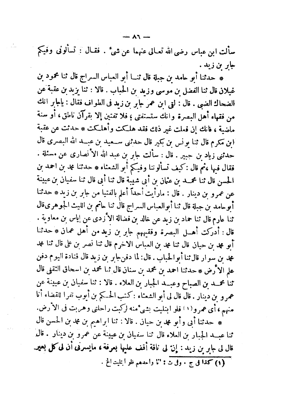حَدَّثَنَا أَبُو حَامِدِ بْنُ جَبَلَةَ، قَالَ: ثَنَا أَبُو الْعَبَّاسِ السَّرَّاجُ، قَالَ: ثَنَا حَاتِمُ بْنُ اللَّيْثِ الْجَوْهَرِيُّ، قَالَ: ثَنَا عَارِمٌ، قَالَ: ثَنَا حَمَّادُ بْنُ زَيْدٍ، عَنْ خَالِدِ بْنِ فَضَالَةَ الْأَزْدِيِّ، عَنْ إِيَاسِ بْنِ مُعَاوِيَةَ، قَالَ: «§أَدْرَكْتُ أَهْلَ الْبَصْرَةِ وَفَقِيهُهُمْ جَابِرُ بْنُ زَيْدٍ مِنْ أَهْلِ عُمَانَ»