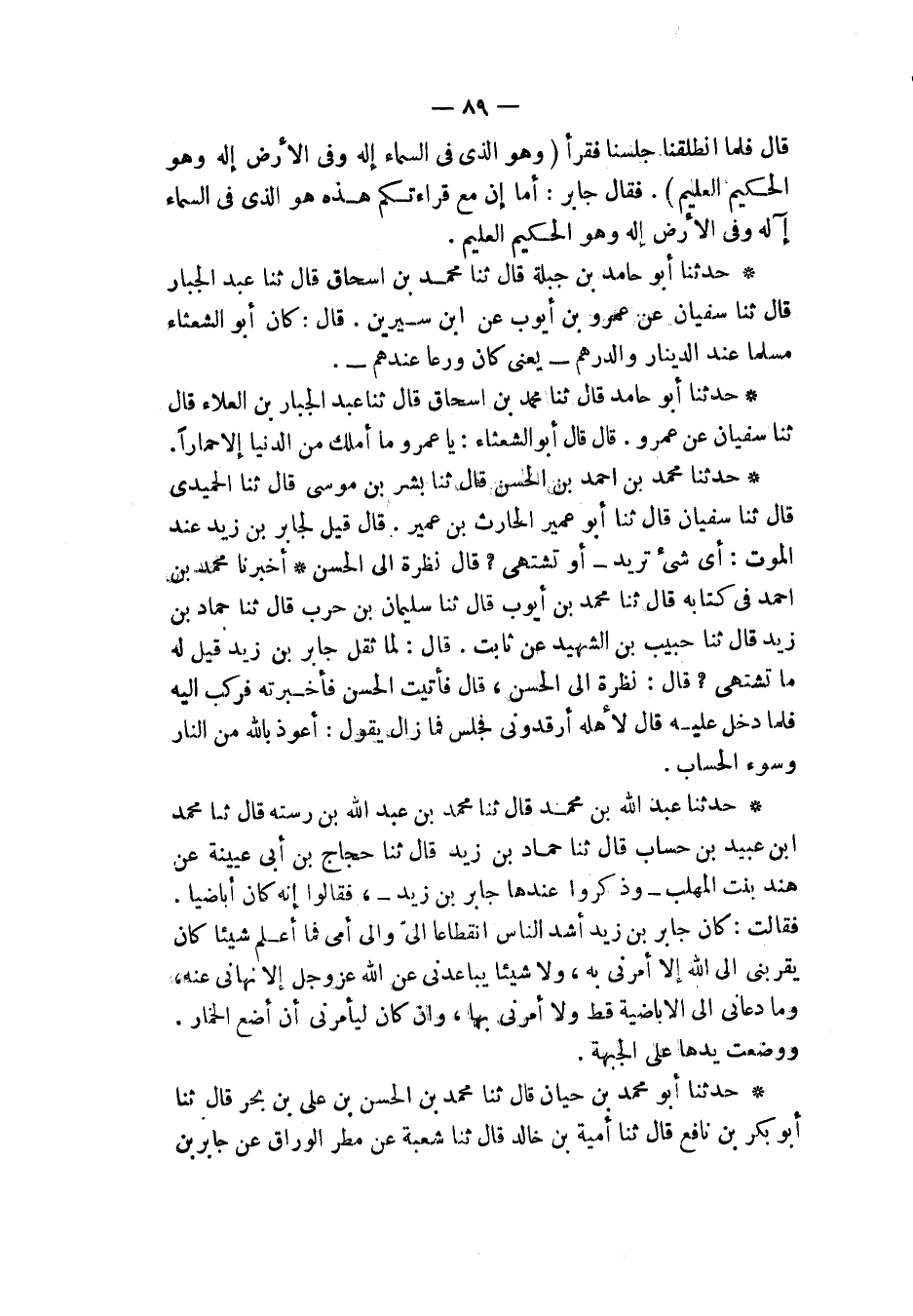 حَدَّثَنَا عَبْدُ اللهِ بْنُ مُحَمَّدٍ، قَالَ: ثَنَا مُحَمَّدُ بْنُ عَبْدِ اللهِ بْنِ رُسْتَةَ، قَالَ: ثَنَا مُحَمَّدُ بْنُ عُبَيْدِ بْنِ حِسَابٍ قَالَ: ثَنَا حَمَّادُ بْنُ زَيْدٍ، قَالَ: ثَنَا حَجَّاجُ بْنُ أَبِي عُثْمَانَ، عَنْ هِنْدِ بِنْتِ الْمُهَلَّبِ وَذَكَرُوا عِنْدَهَا جَابِرَ بْنَ زَيْدٍ فَقَالُوا: " §إِنَّهُ كَانَ أَبَاضِيًّا، فَقَالَتْ: كَانَ جَابِرُ بْنُ زَيْدٍ أَشَدَّ النَّاسِ انْقِطَاعًا إِلَيَّ وَإِلَى أُمِّي، فَمَا أَعْلَمُ شَيْئًا كَانَ يُقَرِّبُنِي إِلَى اللهِ إِلَّا أَمَرَنِي بِهِ، وَلَا شَيْئًا يُبَاعِدُنِي، عَنِ اللهِ عَزَّ وَجَلَّ إِلَّا نَهَانِي عَنْهُ، وَمَا دَعَانِي إِلَى الْأَبَاضِيَّةِ قَطُّ، وَلَا أَمَرَنِي بِهَا، وَإِنْ كَانَ لَيَأْمُرُنِي أَنْ أَضَعَ الْخِمَارَ، وَوَضَعَتْ يَدَهَا عَلَى الْجَبْهَةِ "