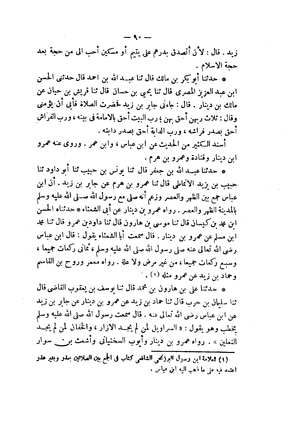حَدَّثَنَا أَبُو بَكْرِ بْنُ مَالِكٍ، قَالَ: ثَنَا عَبْدُ اللهِ بْنُ أَحْمَدَ، قَالَ: حَدَّثَنِي الْحَسَنُ بْنُ عَبْدِ الْعَزِيزِ الْمِصْرِيُّ، قَالَ: ثَنَا يَحْيَى بْنُ حَسَّانَ، قَالَ: ثَنَا قُرَيْشُ بْنُ حَيَّانَ، عَنْ مَالِكِ بْنِ دِينَارٍ، قَالَ: " جَاءَنِي جَابِرُ بْنُ زَيْدٍ فَحَضَرَتِ الصَّلَاةُ فَأَبَى أَنْ يَؤُمَّنِي، وَقَالَ: §ثَلَاثٌ رَبُّهُنَّ أَحَقُّ بِهِنَّ: رَبُّ الْبَيْتِ أَحَقُّ بِالْإِمَامَةِ فِي بَيْتِهِ، وَرَبُّ الْفِرَاشِ أَحَقُّ بِصَدْرِ فِرَاشِهِ، وَرَبُّ الدَّابَّةِ أَحَقُّ بِصَدْرِ دَابَّتِهِ " أَسْنَدَ الْكَثِيرَ مِنَ الْحَدِيثِ عَنِ ابْنِ عَبَّاسٍ وَابْنِ عُمَرَ وَرَوَى عَنْهُ عَمْرُو بْنُ دِينَارٍ وَقَتَادَةُ وَعَمْرُو بْنُ هَرِمٍ