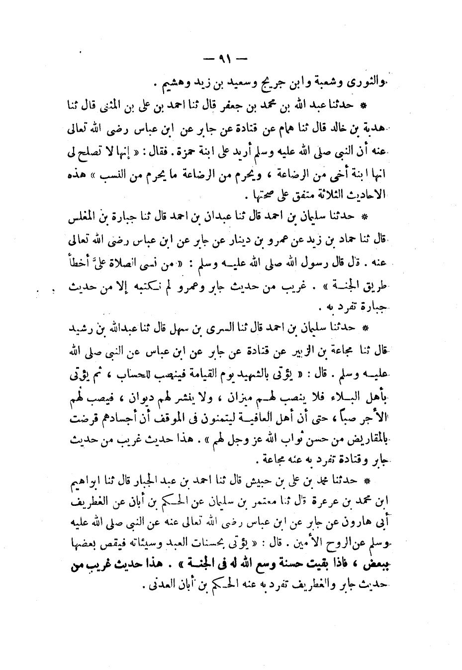 حَدَّثَنَا عَبْدُ اللهِ بْنُ مُحَمَّدِ بْنِ جَعْفَرٍ، قَالَ: ثَنَا أَحْمَدُ بْنُ عَلِيِّ بْنِ الْمُثَنَّى، قَالَ: ثَنَا هُدْبَةُ بْنُ خَالِدٍ قَالَ: ثَنَا هَمَّامٌ، عَنْ قَتَادَةَ، عَنْ جَابِرٍ، عَنِ ابْنِ عَبَّاسٍ، رَضِيَ اللهُ تَعَالَى عَنْهُ، " أَنَّ النَّبِيَّ صَلَّى اللهُ عَلَيْهِ وَسَلَّمَ أُرِيدَ عَلَى ابْنَةِ حَمْزَةَ، فَقَالَ: «§إِنَّهَا لَا تَصْلُحُ لِي، إِنَّهَا ابْنَةُ أَخِي مِنَ الرَّضَاعَةِ، وَيَحْرُمُ مِنَ الرَّضَاعَةِ مَا يَحْرُمُ مِنَ النَّسَبِ» هَذِهِ الْأَحَادِيثُ الثَّلَاثَةُ مُتَّفَقٌ عَلَى صِحَّتِهَا