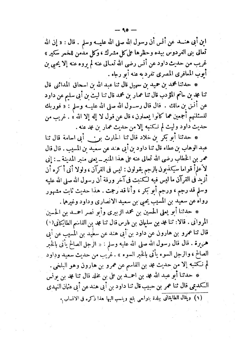 حَدَّثَنَا أَبُو بَكْرِ بْنُ خَلَّادٍ، قَالَ: ثَنَا الْحَارِثُ بْنُ أَبِي أُسَامَةَ، قَالَ: ثَنَا عَبْدُ الْوَهَّابِ بْنُ عَطَاءٍ، قَالَ: ثَنَا دَاوُدُ بْنُ أَبِي هِنْدٍ، عَنْ سَعِيدِ بْنِ الْمُسَيِّبِ، قَالَ: قَالَ عُمَرُ بْنُ الْخَطَّابِ رَضِيَ اللهُ تَعَالَى عَنْهُ عَلَى هَذَا الْمِنْبَرِ يَعْنِي مِنْبَرَ الْمَدِينَةِ: " §إِنِّي لَأَعْلَمُ أَقْوَامًا سَيُكَذِّبُونَ بِالرَّجْمِ يَقُولُونَ: لَيْسَ فِي الْقُرْآنِ، وَلَوْلَا أَنِّي أَكْرَهُ أَنْ أَزِيدَ فِي الْقُرْآنِ مَا لَيْسَ فِيهِ لَكَتَبْتُ فِي آخِرِ وَرَقَةٍ: إِنَّ رَسُولَ اللهِ صَلَّى اللهُ عَلَيْهِ وَسَلَّمَ قَدْ رَجَمَ، وَرَجَمَ أَبُو بَكْرٍ، وَأَنَا قَدْ رَجَمْتُ " هَذَا حَدِيثٌ ثَابِتٌ مَشْهُورٌ رَوَاهُ عَنْ سَعِيدِ بْنِ الْمُسَيِّبِ يَحْيَى بْنُ سَعِيدٍ الْأَنْصَارِيُّ وَدَاوُدُ وَغَيْرُهُمَا