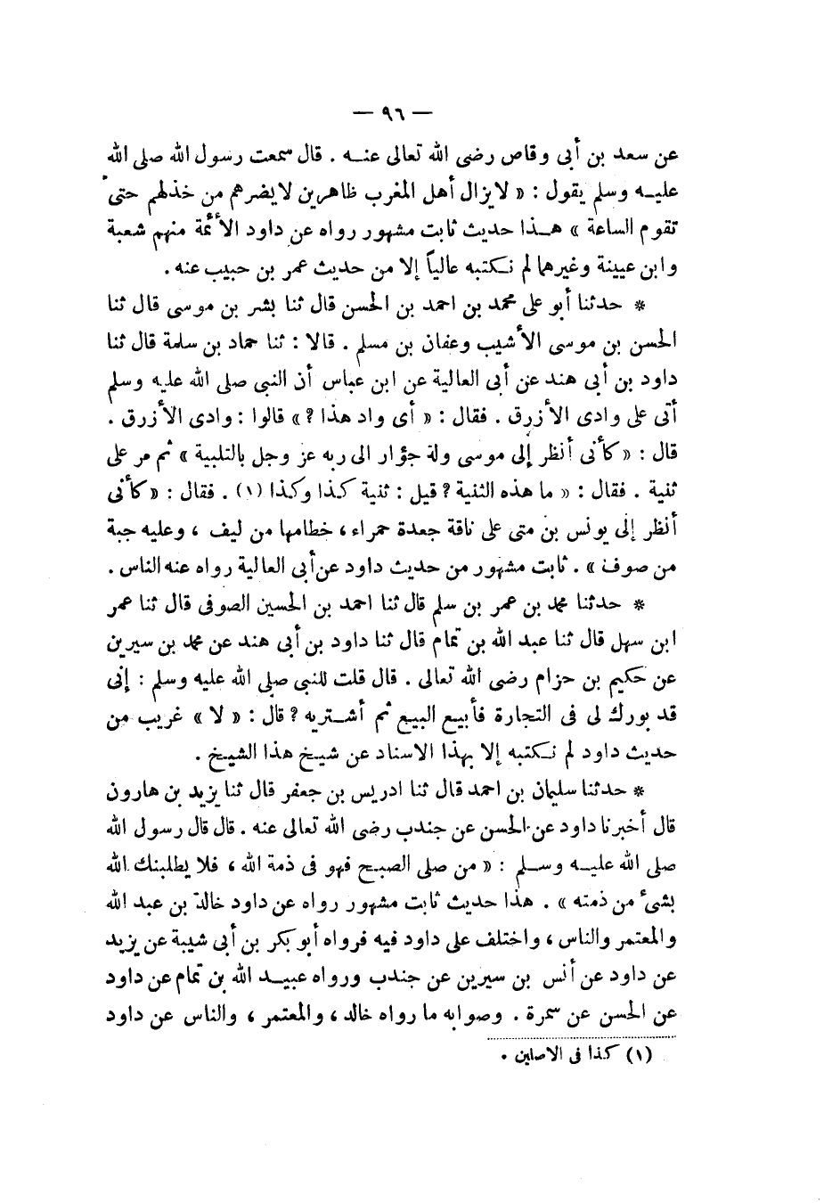 حَدَّثَنَا مُحَمَّدُ بْنُ عُمَرَ بْنِ سَلْمٍ، قَالَ: ثَنَا أَحْمَدُ بْنُ الْحُسَيْنِ الصُّوفِيُّ، قَالَ: ثَنَا عُمَرُ بْنُ سَهْلٍ، قَالَ: ثَنَا عَبْدُ اللهِ بْنُ تَمَامٍ، قَالَ: ثَنَا دَاوُدُ بْنُ أَبِي هِنْدٍ، عَنْ مُحَمَّدِ بْنِ سِيرِينَ، عَنْ حَكِيمِ بْنِ حِزَامٍ رَضِيَ اللهُ تَعَالَى عَنْهُ قَالَ: قُلْتُ لِلنَّبِيِّ صَلَّى اللهُ عَلَيْهِ وَسَلَّمَ: " §إِنِّي قَدْ بُورِكَ لِي فِي التِّجَارَةِ فَأَبِيعُ الْبَيْعَ ثُمَّ أَشْتَرِيهِ قَالَ: «لَا» غَرِيبٌ مِنْ حَدِيثِ دَاوُدَ، لَمْ نَكْتُبْهُ إِلَّا بِهَذَا الْإِسْنَادِ، عَنْ شَيْخِ هَذَا الشَّيْخِ