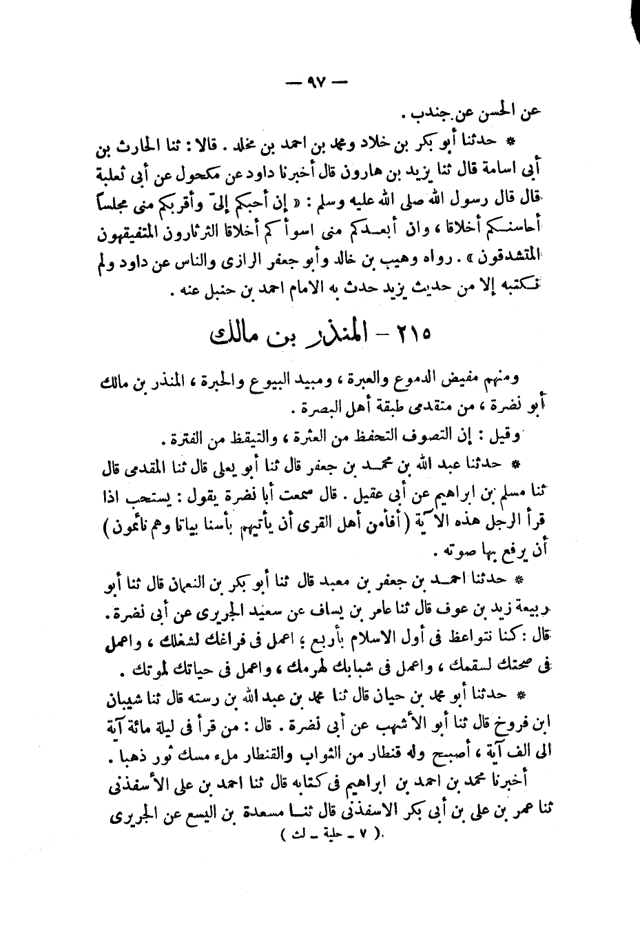 §الْمُنْذِرُ بْنُ مَالِكٍ وَمِنْهُمْ مُفِيضُ الدُّمُوعِ وَالْعَبْرَةِ، وَمُبِيدُ الْبُيُوعِ وَالْحَبَرَةِ، الْمُنْذِرُ بْنُ مَالِكٍ أَبُو نَضْرَةَ مِنْ مُتَقَدِّمِي طَبَقَةِ أَهْلِ الْبَصْرَةِ. وَقِيلَ: إِنَّ التَّصَوُّفَ التَّحَفُّظُ مِنَ الْعَثْرَةِ، وَالتَّيَقُّظُ مِنَ الْفَتْرَةِ