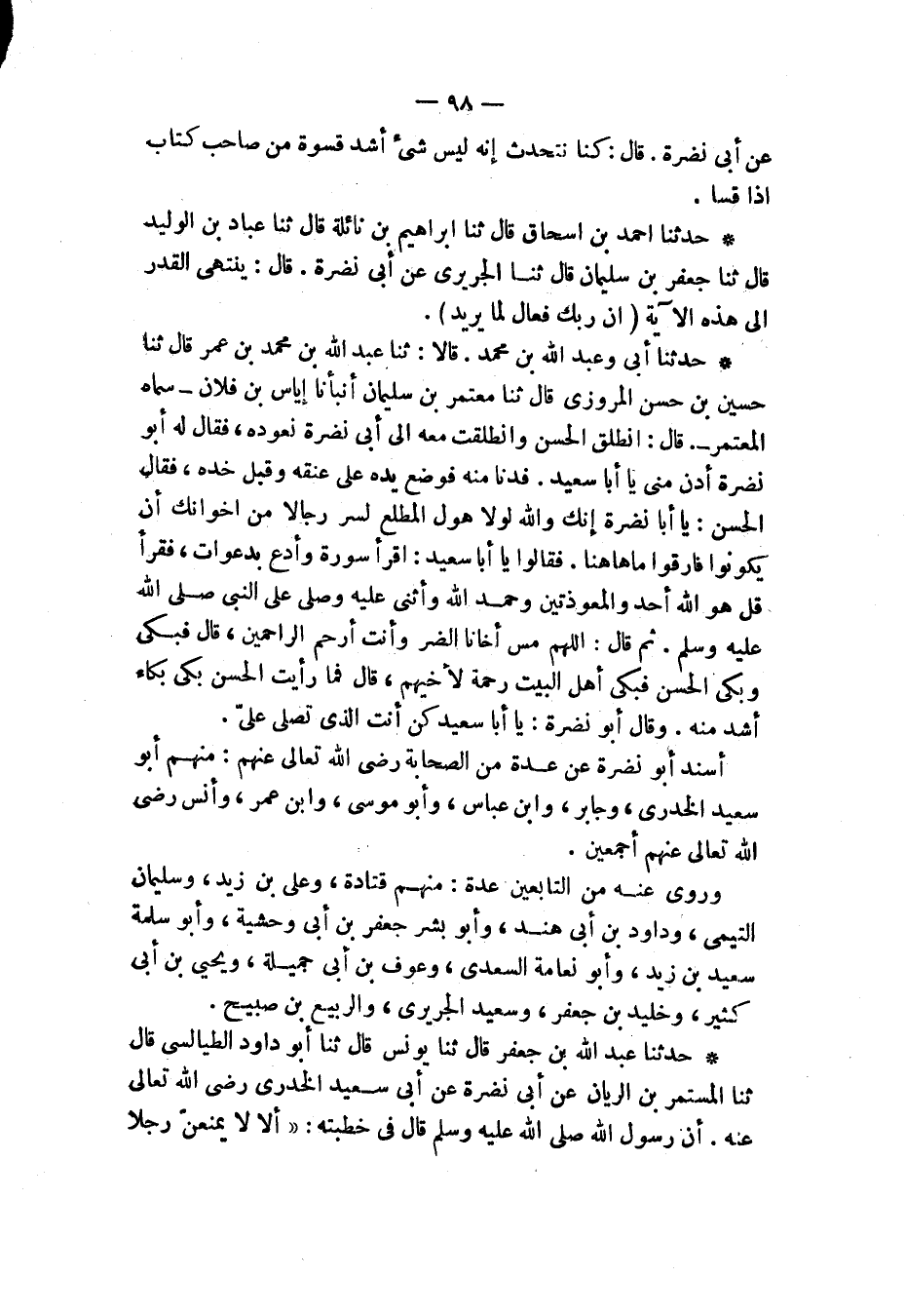 حَدَّثَنَا أَبِي وَعَبْدُ اللهِ بْنُ مُحَمَّدٍ قَالَا: ثَنَا عَبْدُ اللهِ بْنُ مُحَمَّدِ بْنِ عُمَرَ، قَالَ: ثَنَا حُسَيْنُ بْنُ حَسَنٍ الْمَرْوَزِيُّ قَالَ: ثَنَا مُعْتَمِرُ بْنُ سُلَيْمَانَ، أَنْبَأَنَا إِيَاسُ بْنُ فُلَانٍ، سَمَّاهُ الْمُعْتَمِرُ قَالَ: " انْطَلَقَ الْحَسَنُ وَانْطَلَقْتُ مَعَهُ إِلَى أَبِي نَضْرَةَ نَعُودُهُ، فَقَالَ لَهُ أَبُو نَضْرَةَ: " §ادْنُ مِنِّي يَا أَبَا سَعِيدٍ، فَدَنَا مِنْهُ، فَوَضَعَ يَدَهُ عَلَى عُنُقِهِ، وَقَبَّلَ خَدَّهُ، فَقَالَ الْحَسَنُ: يَا أَبَا نَضْرَةَ إِنَّكَ وَاللهِ لَوْلَا هَوْلُ الْمَطْلَعِ لَسَرَّ رِجَالًا مِنْ إِخْوَانِكَ أَنْ يَكُونُوا فَارَقُوا مَا هَاهُنَا، فَقَالُوا: يَا أَبَا سَعِيدٍ: اقْرَأْ سُورَةً وَادْعُ بِدَعَوَاتٍ، فَقَرَأَ: قُلْ هُوَ اللهُ أَحَدٌ، وَالْمُعَوِّذَتَيْنِ وَحَمِدَ اللهَ وَأَثْنَى عَلَيْهِ وَصَلَّى عَلَى النَّبِيِّ صَلَّى اللهُ عَلَيْهِ وَسَلَّمَ، ثُمَّ قَالَ: اللهُمَّ مَسَّ أَخَانَا الضُّرُّ وَأَنْتَ أَرْحَمُ الرَّاحِمِينَ، قَالَ: فَبَكَى وَبَكَى الْحَسَنُ فَبَكَى أَهْلُ الْبَيْتِ رَحْمَةً لِأَخِيهِمْ، قَالَ: فَمَا رَأَيْتُ الْحَسَنَ بَكَى بُكَاءً أَشَدَّ مِنْهُ، وَقَالَ أَبُو نَضْرَةَ: يَا أَبَا سَعِيدٍ كُنْ أَنْتَ الَّذِي تُصَلِّي عَلَيَّ " أَسْنَدَ أَبُو نَضْرَةَ، عَنْ عِدَّةٍ مِنَ الصَّحَابَةِ رَضِيَ اللهُ تَعَالَى عَنْهُمْ، مِنْهُمْ: أَبُو سَعِيدٍ الْخُدْرِيُّ وَجَابِرٌ وَابْنُ عَبَّاسٍ وَأَبُو مُوسَى وَابْنُ عُمَرَ وَأَنَسٌ رَضِيَ اللهُ تَعَالَى عَنْهُمْ أَجْمَعِينَ. وَرَوَى عَنْهُ مِنَ التَّابِعِينَ عِدَّةٌ: مِنْهُمْ قَتَادَةُ وَعَلِيُّ بْنُ زَيْدٍ وَسُلَيْمَانُ التَّيْمِيُّ وَدَاوُدُ بْنُ أَبِي هِنْدٍ، وَأَبُو بِشْرٍ جَعْفَرُ بْنُ أَبِي وَحْشِيَّةَ، وَأَبُو سَلَمَةَ سَعِيدُ بْنُ زَيْدٍ، وَأَبُو نَعَامَةَ السَّعْدِيُّ وَعَوْفُ بْنُ أَبِي جَمِيلَةَ وَيَحْيَى بْنُ أَبِي كَثِيرٍ، وَخُلَيْدُ بْنُ جَعْفَرٍ وَسَعِيدٌ الْجُرَيْرِيُّ وَالرَّبِيعُ بْنُ صُبَيْحٍ