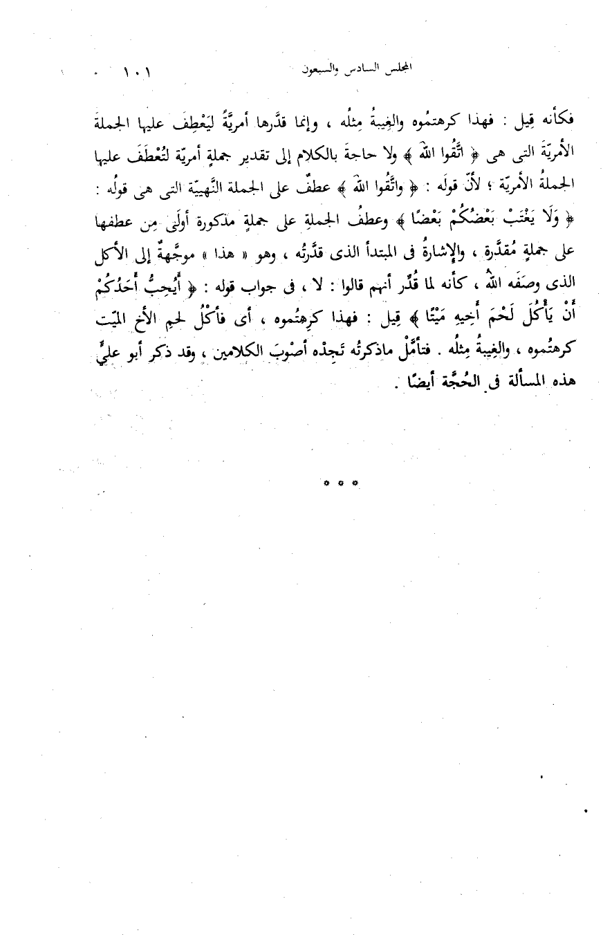 {وَلا يَغْتَبْ بَعْضُكُمْ بَعْضاً} وعطف الجملة على جملة مذكورة أولى من عطفها على جملة مقدّرة، والإشارة فى المبتدأ الذى قدّرته، وهو «هذا» موجّهة إلى الأكل الذى وصفه الله، كأنه لما قدّر أنهم قالوا: لا، فى جواب قوله: {أَيُحِبُّ أَحَدُكُمْ أَنْ يَأْكُلَ لَحْمَ أَخِيهِ مَيْتاً} قيل: فهذا كرهتموه، أى فأكل لحم الأخ الميّت كرهتموه، والغيبة مثله. فتأمّل ما ذكرته تجده أصوب الكلامين، وقد ذكر أبو عليّ هذه المسألة فى الحجّة أيضا.