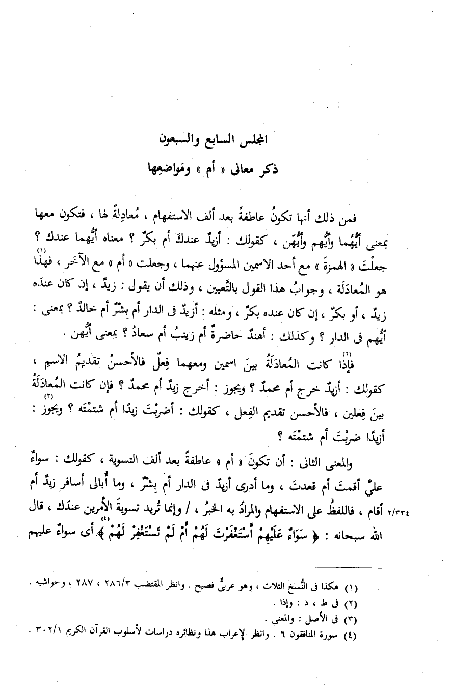 فمن ذلك أنها تكون عاطفة بعد ألف الاستفهام، معادلة لها، فتكون معها بمعنى أيّهما وأيّهم وأيّهنّ، كقولك: أزيد عندك أم بكر؟ معناه أيّهما عندك؟ جعلت «الهمزة» مع أحد الاسمين المسئول عنهما، وجعلت «أم» مع الآخر، فهذا (¬1) هو المعادلة، وجواب هذا القول بالتّعيين، وذلك أن يقول: زيد، إن كان عنده زيد، أو بكر، إن كان عنده بكر، ومثله: أزيد فى الدار أم بشر أم خالد؟ بمعنى: