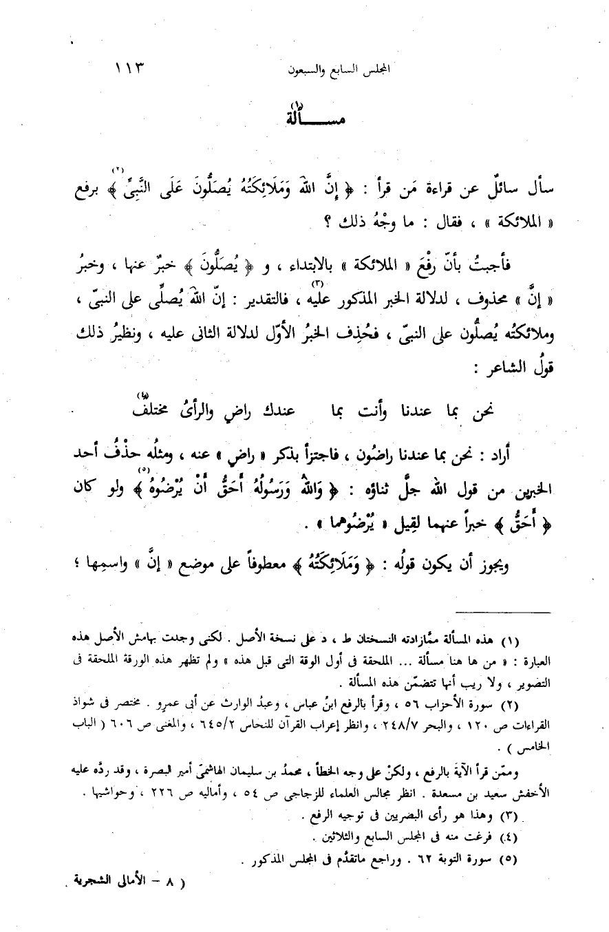 سأل سائل عن قراءة من قرأ: {إِنَّ اللهَ وَمَلائِكَتَهُ يُصَلُّونَ عَلَى النَّبِيِّ} (¬2) برفع «الملائكة»، فقال: ما وجه ذلك؟