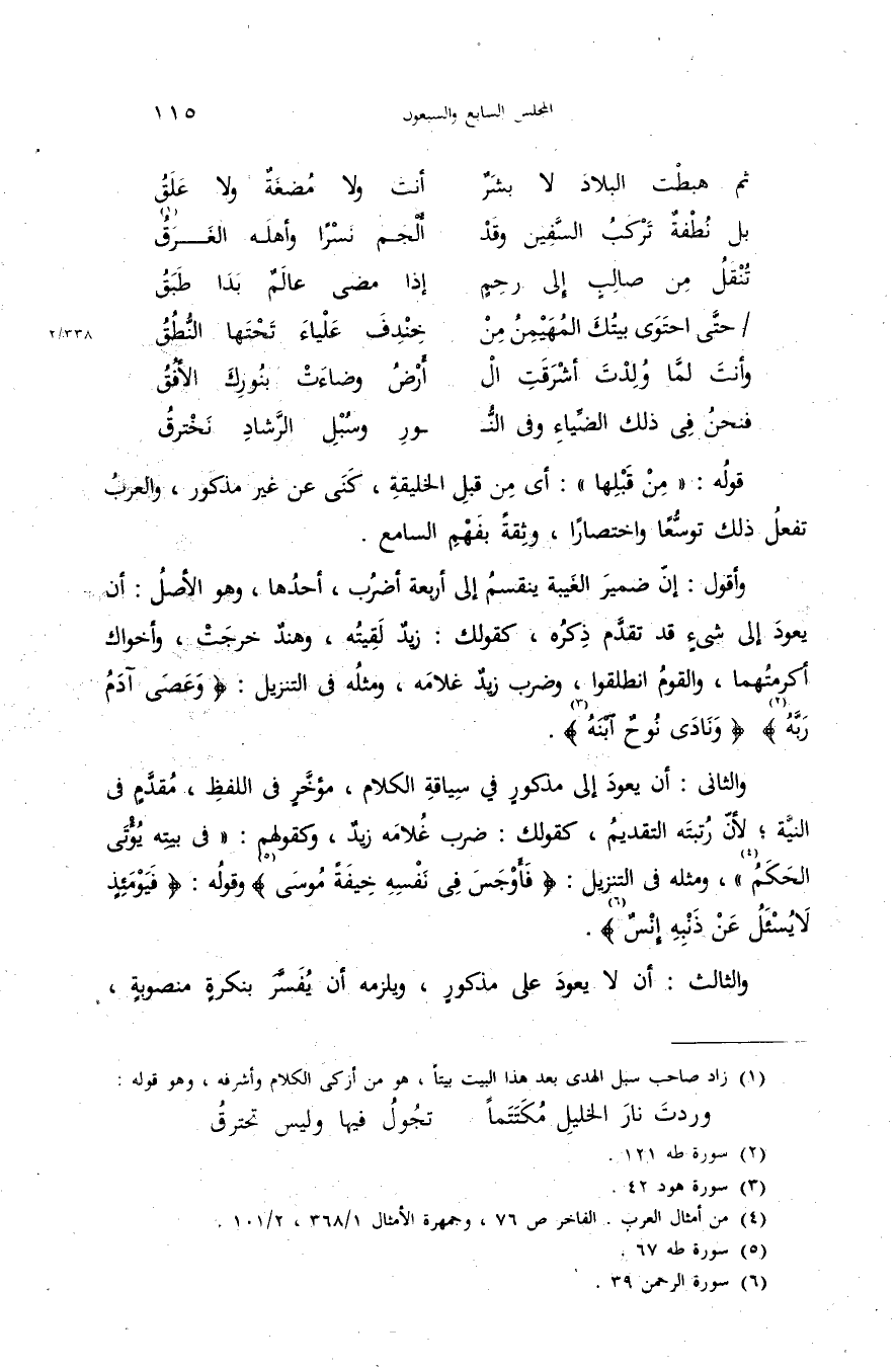 والثانى: أن يعود إلى مذكور في سياقة الكلام، مؤخّر فى اللفظ، مقدّم فى النيّة؛ لأنّ رتبته التقديم، كقولك: ضرب غلامه زيد، وكقولهم: «فى بيته يؤتى الحكم (¬4)»، ومثله فى التنزيل: {فَأَوْجَسَ فِي نَفْسِهِ خِيفَةً مُوسى} (¬5) وقوله: {فَيَوْمَئِذٍ لا يُسْئَلُ عَنْ ذَنْبِهِ إِنْسٌ} (¬6).