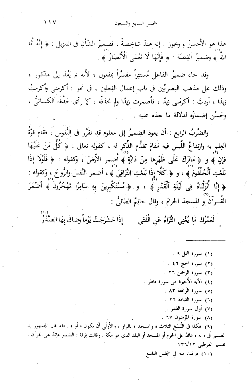 {إِنّا أَنْزَلْناهُ فِي لَيْلَةِ الْقَدْرِ} (¬7)، و {مُسْتَكْبِرِينَ بِهِ سامِراً تَهْجُرُونَ} (¬8) أضمر القرآن (¬9) والمسجد الحرام، وقال حاتم الطائىّ: