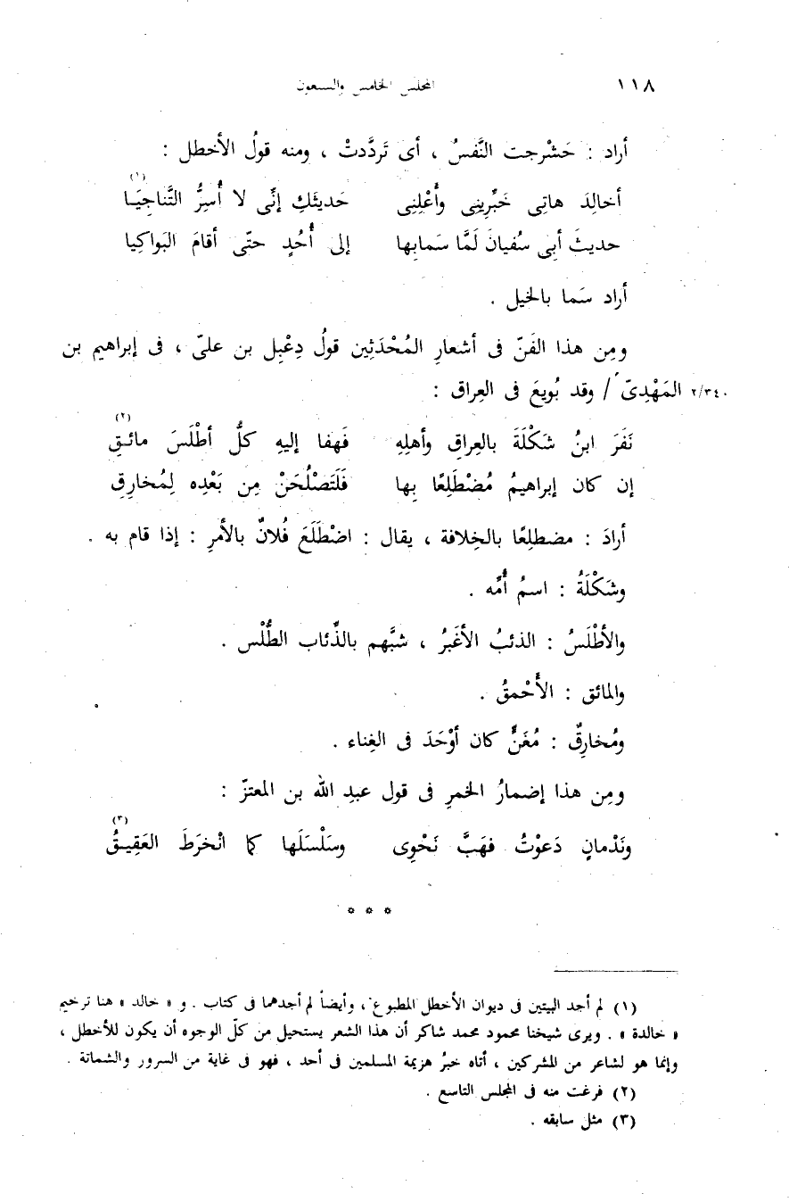 (¬1) لم أجد البيتين فى ديوان الأخطل المطبوع، وأيضا لم أجدهما فى كتاب. و «خالد» هنا ترخيم «خالدة». ويرى شيخنا محمود محمد شاكر أن هذا الشعر يستحيل من كلّ الوجوه أن يكون للأخطل، وإنما هو لشاعر من المشركين، أتاه خبر هزيمة المسلمين فى أحد، فهو فى غاية من السرور والشماتة.