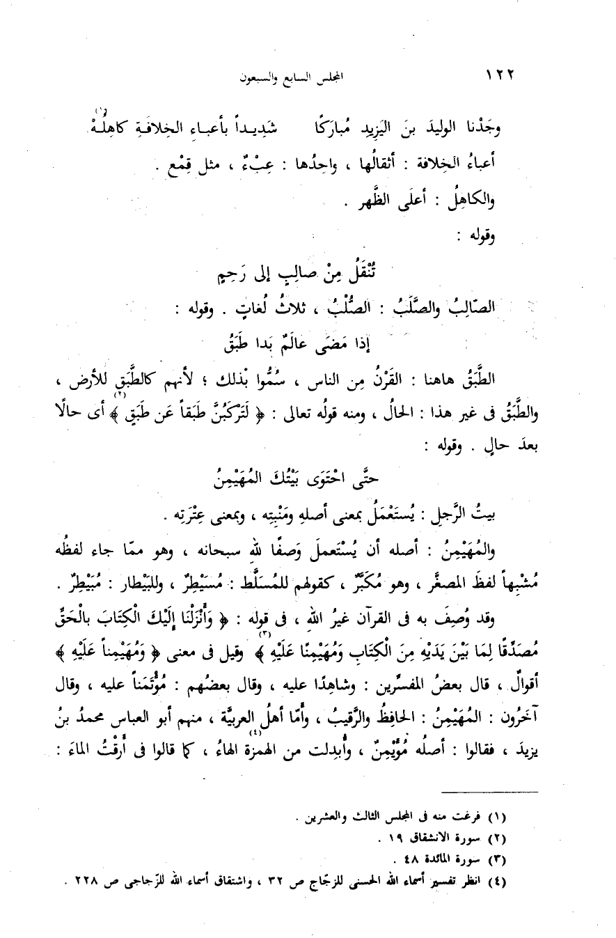 وقد وصف به فى القرآن غير الله، فى قوله: {وَأَنْزَلْنا إِلَيْكَ الْكِتابَ بِالْحَقِّ مُصَدِّقاً لِما بَيْنَ يَدَيْهِ مِنَ الْكِتابِ وَمُهَيْمِناً عَلَيْهِ} (¬3) وقيل فى معنى {وَمُهَيْمِناً عَلَيْهِ} أقوال، قال بعض المفسّرين: وشاهدا عليه، وقال بعضهم: مؤتمنا عليه، وقال آخرون: المهيمن: الحافظ والرّقيب، وأمّا أهل العربيّة، منهم أبو العباس محمد بن يزيد، فقالوا: أصله مؤيمن، وأبدلت من الهمزة (¬4) الهاء، كما قالوا فى أرقت الماء: