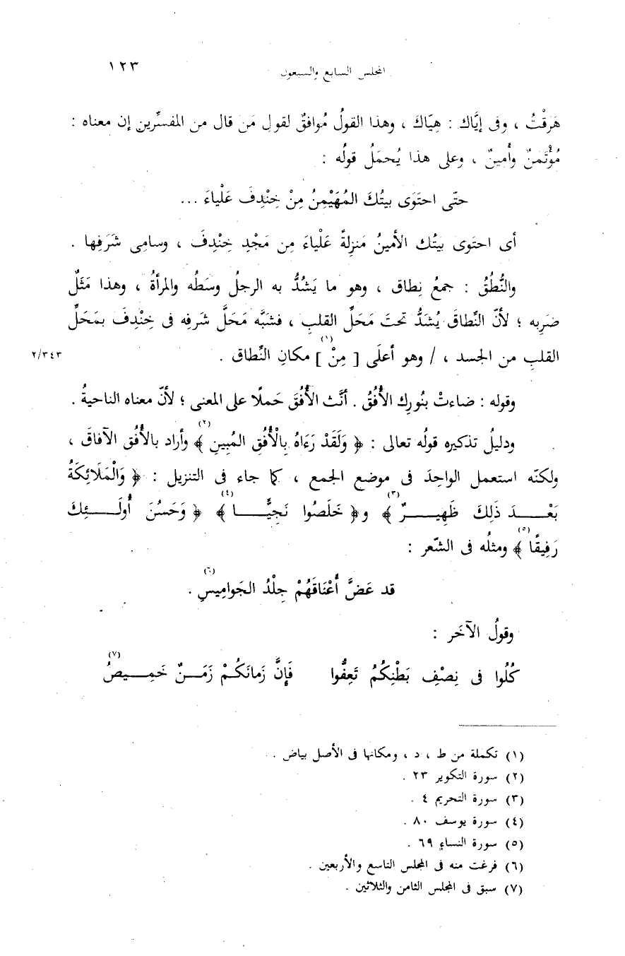 ودليل تذكيره قوله تعالى: {وَلَقَدْ رَآهُ بِالْأُفُقِ الْمُبِينِ} (¬2) وأراد بالأفق الآفاق، ولكنّه استعمل الواحد فى موضع الجمع، كما جاء فى التنزيل: {وَالْمَلائِكَةُ بَعْدَ ذلِكَ ظَهِيرٌ} (¬3) و {خَلَصُوا نَجِيًّا} (¬4) {وَحَسُنَ أُولئِكَ رَفِيقاً} (¬5) ومثله فى الشّعر: