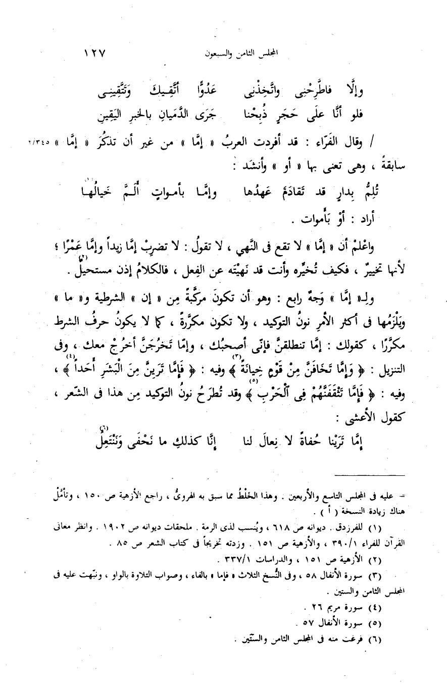 (¬3) سورة الأنفال 58، وفى النّسخ الثلاث «فإما» بالفاء، وصواب التلاوة بالواو، ونبّهت عليه فى المجلس الثامن والستين.
