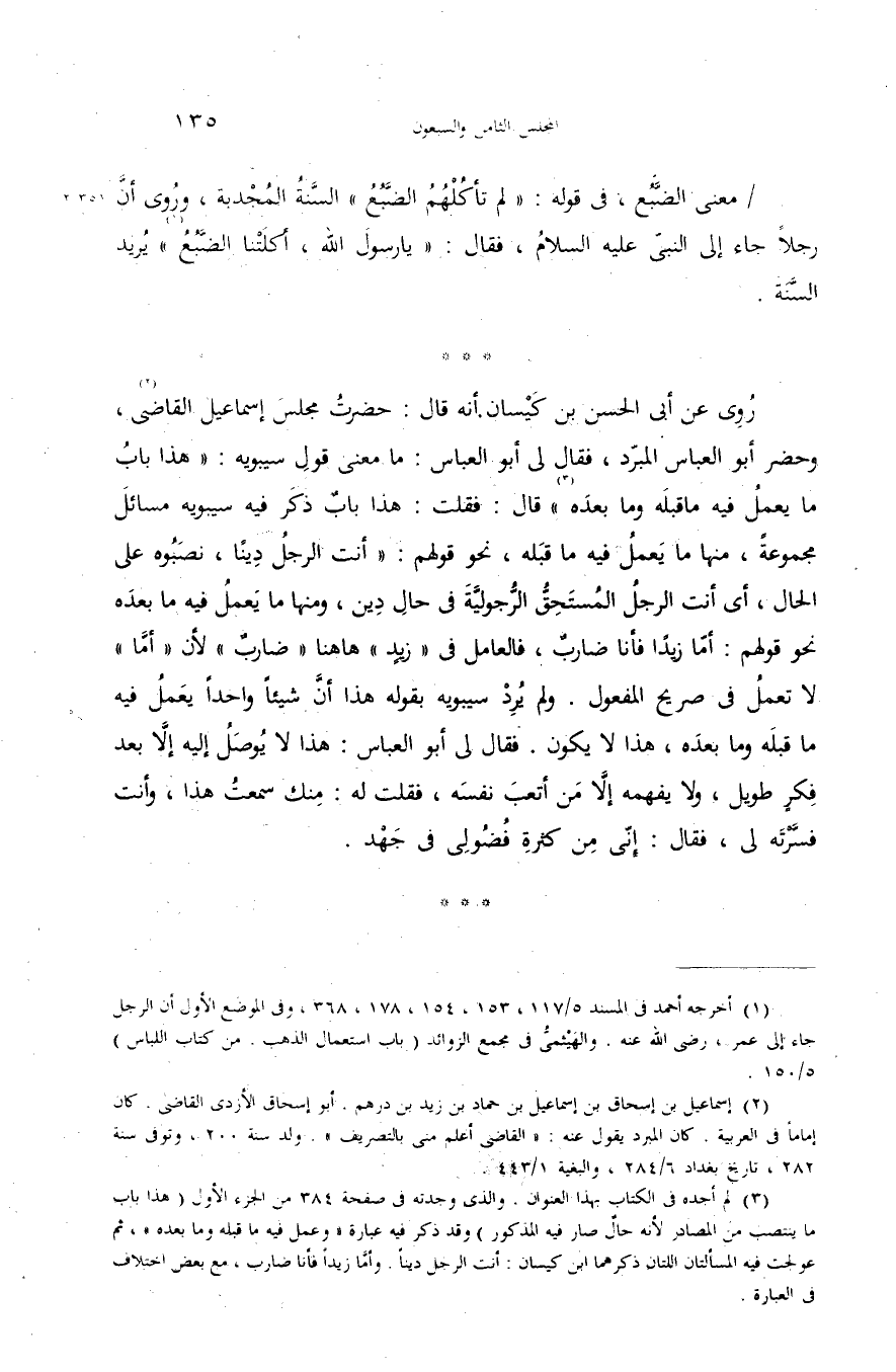 ... روى عن أبى الحسن بن كيسان أنه قال: حضرت مجلس إسماعيل القاضى (¬2)، وحضر أبو العباس المبرّد، فقال لى أبو العباس: ما معنى قول سيبويه: «هذا باب ما يعمل فيه ما قبله وما بعده (¬3)» قال: فقلت: هذا باب ذكر فيه سيبويه مسائل مجموعة، منها ما يعمل فيه ما قبله، نحو قولهم: «أنت الرجل دينا، نصبوه على الحال، أى أنت الرجل المستحقّ الرّجوليّة فى حال دين، ومنها ما يعمل فيه ما بعده نحو قولهم: أمّا زيدا فأنا ضارب، فالعامل فى «زيد» هاهنا «ضارب» لأن «أمّا» لا تعمل فى صريح المفعول. ولم يرد سيبويه بقوله هذا أنّ شيئا واحدا يعمل فيه ما قبله وما بعده، هذا لا يكون. فقال لى أبو العباس: هذا لا يوصل إليه إلاّ بعد فكر طويل، ولا يفهمه إلاّ من أتعب نفسه، فقلت له: منك سمعت هذا، وأنت فسّرته لى، فقال: إنّى من كثرة فضولى فى جهد.