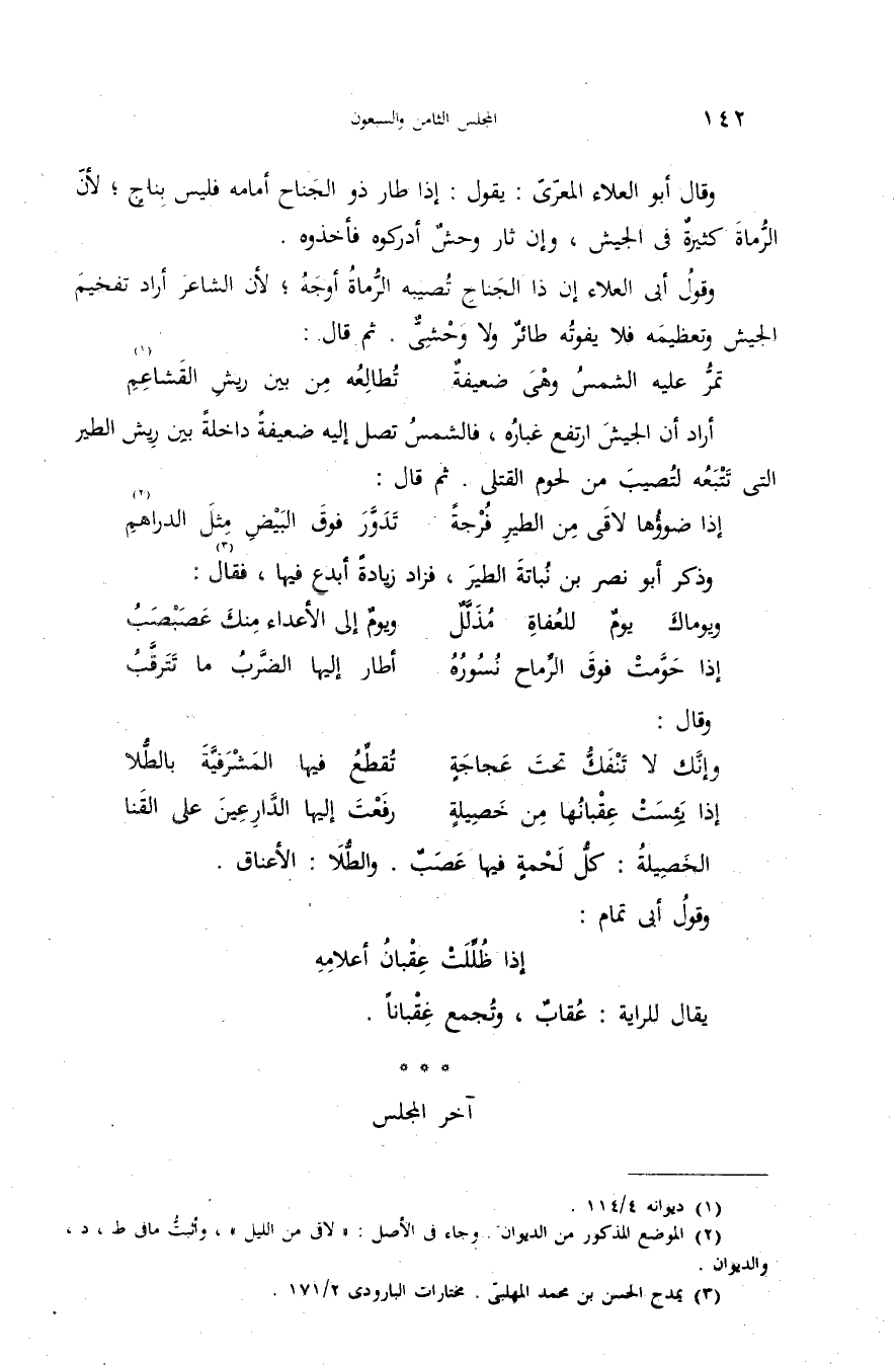وقول أبى العلاء إن ذا الجناح تصيبه الرّماة أوجه؛ لأن الشاعر أراد تفخيم الجيش وتعظيمه فلا يفوته طائر ولا وحشىّ. ثم قال: