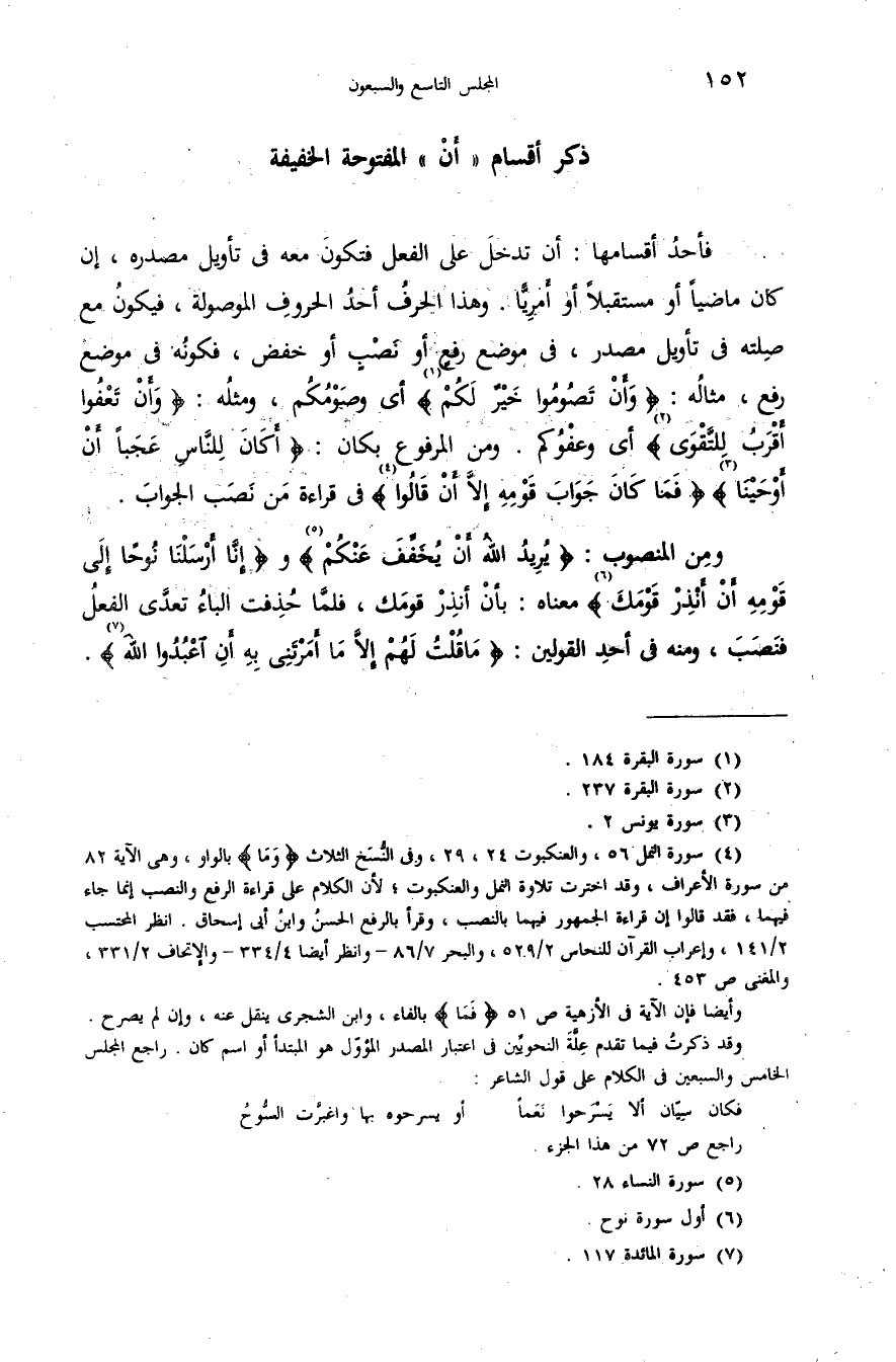 (¬4) سورة النمل 56، والعنكبوت 24،29، وفى النّسخ الثلاث وَما بالواو، وهى الآية 82 من سورة الأعراف، وقد اخترت تلاوة النمل والعنكبوت؛ لأن الكلام على قراءة الرفع والنصب إنما جاء فيهما، فقد قالوا إن قراءة الجمهور فيهما بالنصب، وقرأ بالرفع الحسن وابن أبى إسحاق. انظر المحتسب 2/ 141، وإعراب القرآن للنحاس 2/ 529، والبحر 7/ 86 - وانظر أيضا 4/ 334 - والإتحاف 2/ 331، والمغنى ص 453. وأيضا فإن الآية فى الأزهية ص 51 فَما بالفاء، وابن الشجرى ينقل عنه، وإن لم يصرح. وقد ذكرت فيما تقدم علّة النحويّين فى اعتبار المصدر المؤوّل هو المبتدأ أو اسم كان. راجع المجلس الخامس والسبعين فى الكلام على قول الشاعر: فكان سيّان ألا يسرحوا نعما أو يسرحوه بها واغبرّت السّوح راجع ص 72 من هذا الجزء.