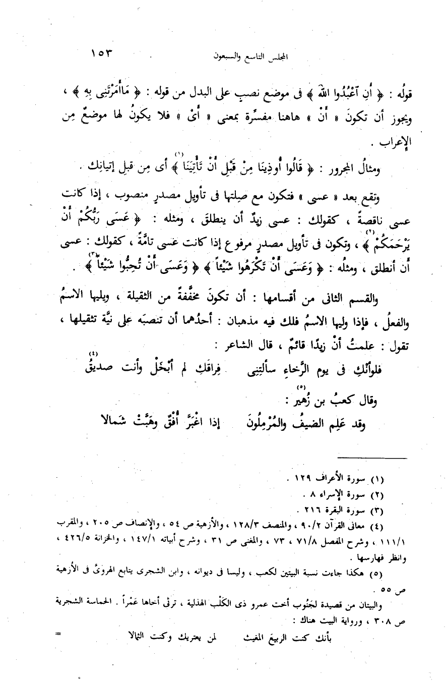 (¬5) هكذا جاءت نسبة البيتين لكعب، وليسا فى ديوانه، وابن الشجرى يتابع الهروىّ فى الأزهية ص 55. والبيتان من قصيدة لجنوب أخت عمرو ذى الكلب الهذلية، ترثى أخاها عمرا. الحماسة الشجرية ص 308، ورواية البيت هناك: بأنك كنت الربيع المغيث لمن يعتريك وكنت الثمالا -