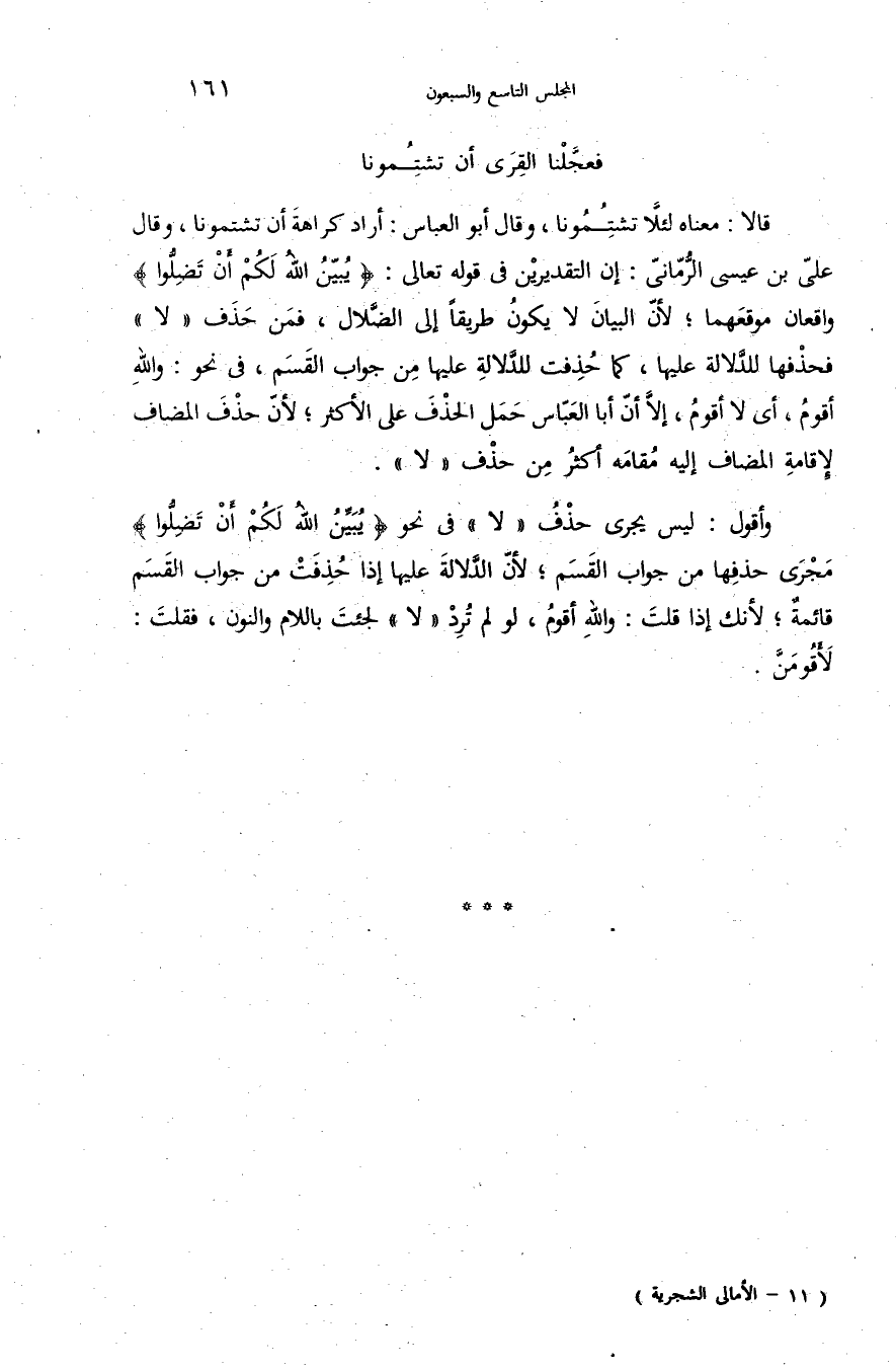 قالا: معناه لئلاّ تشتمونا، وقال أبو العباس: أراد كراهة أن تشتمونا، وقال علىّ بن عيسى الرّمّانىّ: إن التقديرين فى قوله تعالى: {يُبَيِّنُ اللهُ لَكُمْ أَنْ تَضِلُّوا} واقعان موقعهما؛ لأنّ البيان لا يكون طريقا إلى الضّلال، فمن حذف «لا» فحذفها للدّلالة عليها، كما حذفت للدّلالة عليها من جواب القسم، فى نحو: والله أقوم، أى لا أقوم، إلاّ أنّ أبا العبّاس حمل الحذف على الأكثر؛ لأنّ حذف المضاف لإقامة المضاف إليه مقامه أكثر من حذف «لا».