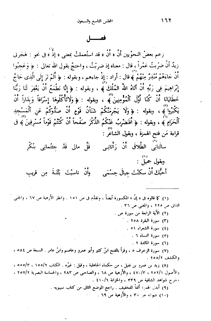 زعم بعض النحويّين أنّ «أن» قد استعملت بمعنى «إذ (¬1)» فى نحو: هجرنى زيد أن ضربت عمرا، قال: معناه إذ ضربت، واحتجّ بقول الله تعالى: {وَعَجِبُوا أَنْ جاءَهُمْ مُنْذِرٌ مِنْهُمْ} (¬2) قال: أراد: إذ جاءهم، وبقوله: {أَلَمْ تَرَ إِلَى الَّذِي حَاجَّ إِبْراهِيمَ فِي رَبِّهِ أَنْ آتاهُ اللهُ الْمُلْكَ} (¬3)، وبقوله: {إِنّا نَطْمَعُ أَنْ يَغْفِرَ لَنا رَبُّنا خَطايانا أَنْ كُنّا أَوَّلَ الْمُؤْمِنِينَ} (¬4)، وبقوله: {وَلا تَأْكُلُوها إِسْرافاً وَبِداراً أَنْ يَكْبَرُوا} (¬5)، وبقوله: {وَلا يَجْرِمَنَّكُمْ شَنَآنُ قَوْمٍ أَنْ صَدُّوكُمْ عَنِ الْمَسْجِدِ الْحَرامِ (¬6)}، وبقوله: {أَفَنَضْرِبُ عَنْكُمُ الذِّكْرَ صَفْحاً أَنْ كُنْتُمْ قَوْماً مُسْرِفِينَ} (¬7) فى قراءة من فتح الهمزة، وبقول الشاعر (¬8):