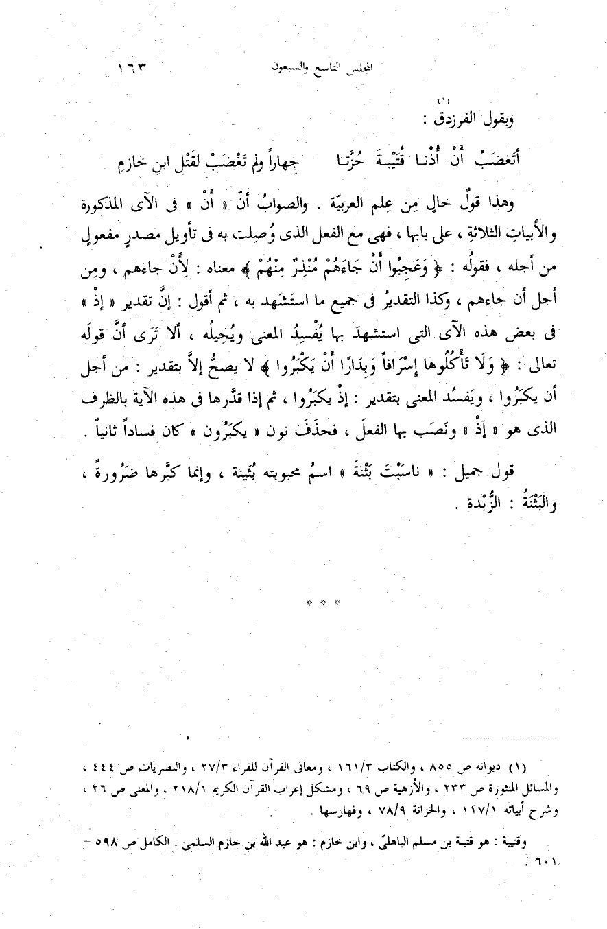 وهذا قول خال من علم العربيّة. والصواب أنّ «أن» فى الآى المذكورة والأبيات الثلاثة، على بابها، فهى مع الفعل الذى وصلت به فى تأويل مصدر مفعول من أجله، فقوله: {وَعَجِبُوا أَنْ جاءَهُمْ مُنْذِرٌ مِنْهُمْ} معناه: لأن جاءهم، ومن أجل أن جاءهم، وكذا التقدير فى جميع ما استشهد به، ثم أقول: إنّ تقدير «إذ» فى بعض هذه الآى التى استشهد بها يفسد المعنى ويحيله، ألا ترى أنّ قوله تعالى: {وَلا تَأْكُلُوها إِسْرافاً وَبِداراً أَنْ يَكْبَرُوا} لا يصحّ إلاّ بتقدير: من أجل أن يكبروا، ويفسد المعنى بتقدير: إذ يكبروا، ثم إذا قدّرها فى هذه الآية بالظرف الذى هو «إذ» ونصب بها الفعل، فحذف نون «يكبرون» كان فسادا ثانيا.