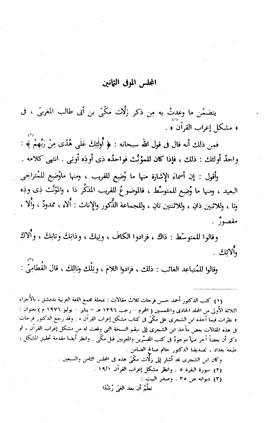 (¬1) كتب الدكتور أحمد حسن فرحات ثلاث مقالات: بمجلة مجمع اللغة العربية بدمشق، بالأجزاء الثلاثة الأولى من المجلد الحادى والخمسين (المحرم-رجب 1396 هـ-يناير. يوليو 1976 م) بعنوان: «نظرات فيما أخذه ابن الشجرى على مكّىّ فى كتاب مشكل إعراب القرآن». وقد رجع الدكتور فرحات فى هذه المقالات بعض مآخذ ابن الشجرى إلى سقم النسخة التى وقعت له من مشكل إعراب القرآن، ثم ذكر أن بعضا آخر منها موجود فى كتب المفسّرين والمعربين قبل مكّى. وانظر أيضا مقدمة تحقيق المشكل، طبعة بغداد، لصديقنا الدكتور حاتم صالح الضامن. وكان ابن الشجرى قد أشار إلى زلاّت مكّىّ هذه فى المجلس الثامن والسبعين.