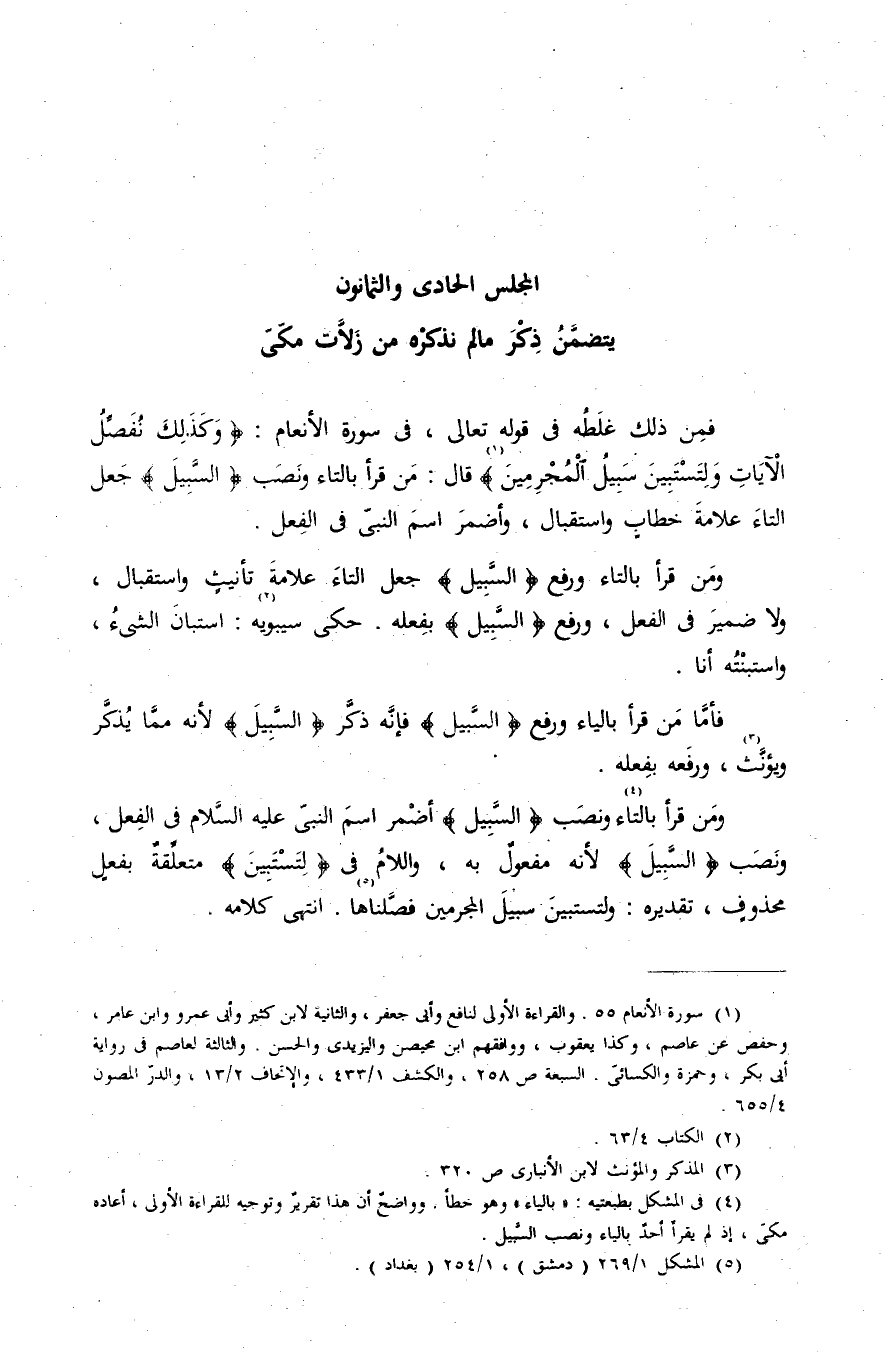 فمن ذلك غلطه فى قوله تعالى، فى سورة الأنعام: {وَكَذلِكَ نُفَصِّلُ الْآياتِ وَلِتَسْتَبِينَ سَبِيلُ الْمُجْرِمِينَ} (¬1) قال: من قرأ بالتاء ونصب ال {سَبِيلُ} جعل التاء علامة خطاب واستقبال، وأضمر اسم النبىّ فى الفعل.