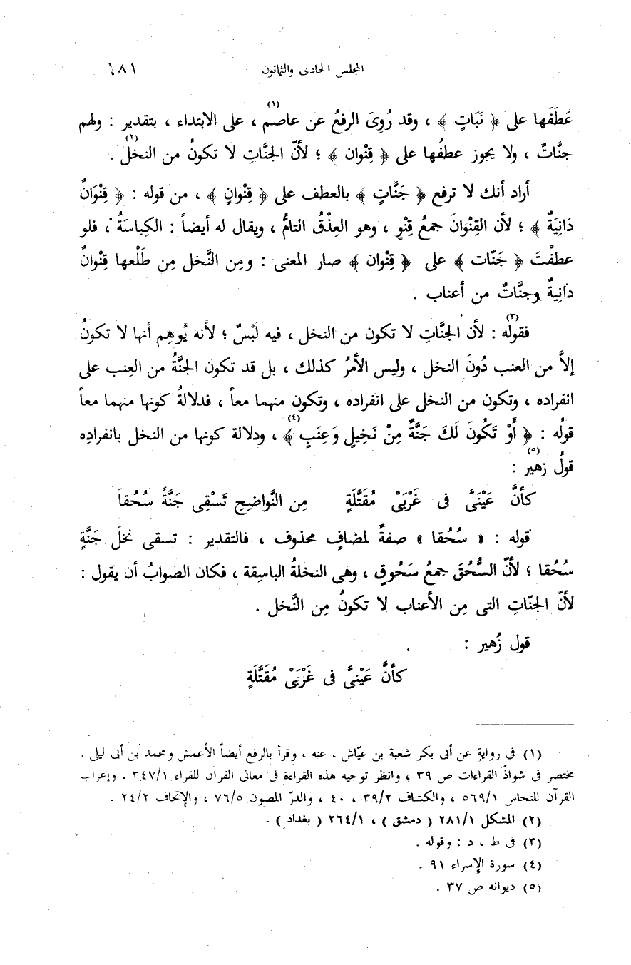 فقوله (¬3): لأن الجنّات لا تكون من النخل، فيه لبس؛ لأنه يوهم أنها لا تكون إلاّ من العنب دون النخل، وليس الأمر كذلك، بل قد تكون الجنّة من العنب على انفراده، وتكون من النخل على انفراده، وتكون منهما معا، فدلالة كونها منهما معا قوله: {أَوْ تَكُونَ لَكَ جَنَّةٌ مِنْ نَخِيلٍ وَعِنَبٍ} (¬4)، ودلالة كونها من النخل بانفراده قول زهير (¬5):