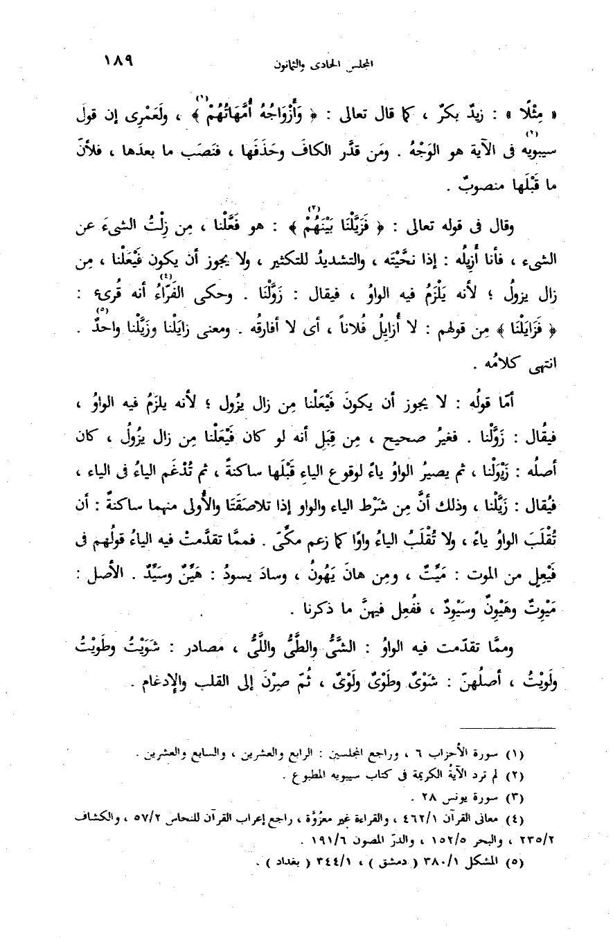 وقال فى قوله تعالى: {فَزَيَّلْنا بَيْنَهُمْ} (¬3): هو فعّلنا، من زلت الشىء عن الشىء، فأنا أزيله: إذا نحّيته، والتشديد للتكثير، ولا يجوز أن يكون فيعلنا، من زال يزول؛ لأنه يلزم فيه الواو، فيقال: زوّلنا. وحكى الفرّاء (¬4) أنه قرئ: