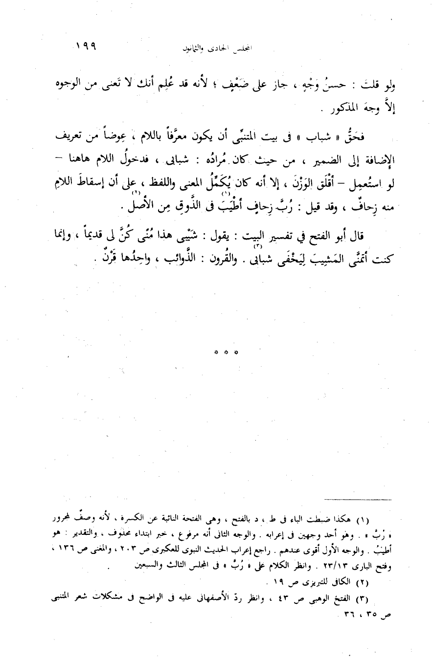 فحقّ «شباب» فى بيت المتنبّى أن يكون معرّفا باللام، عوضا من تعريف الإضافة إلى الضمير، من حيث كان مراده: شبابى، فدخول اللام هاهنا- لو استعمل-أقلق الوزن، إلا أنه كان يكمّل المعنى واللفظ، على أن إسقاط اللام منه زحاف، وقد قيل: ربّ زحاف أطيب (¬1) فى الذّوق من الأصل (¬2).