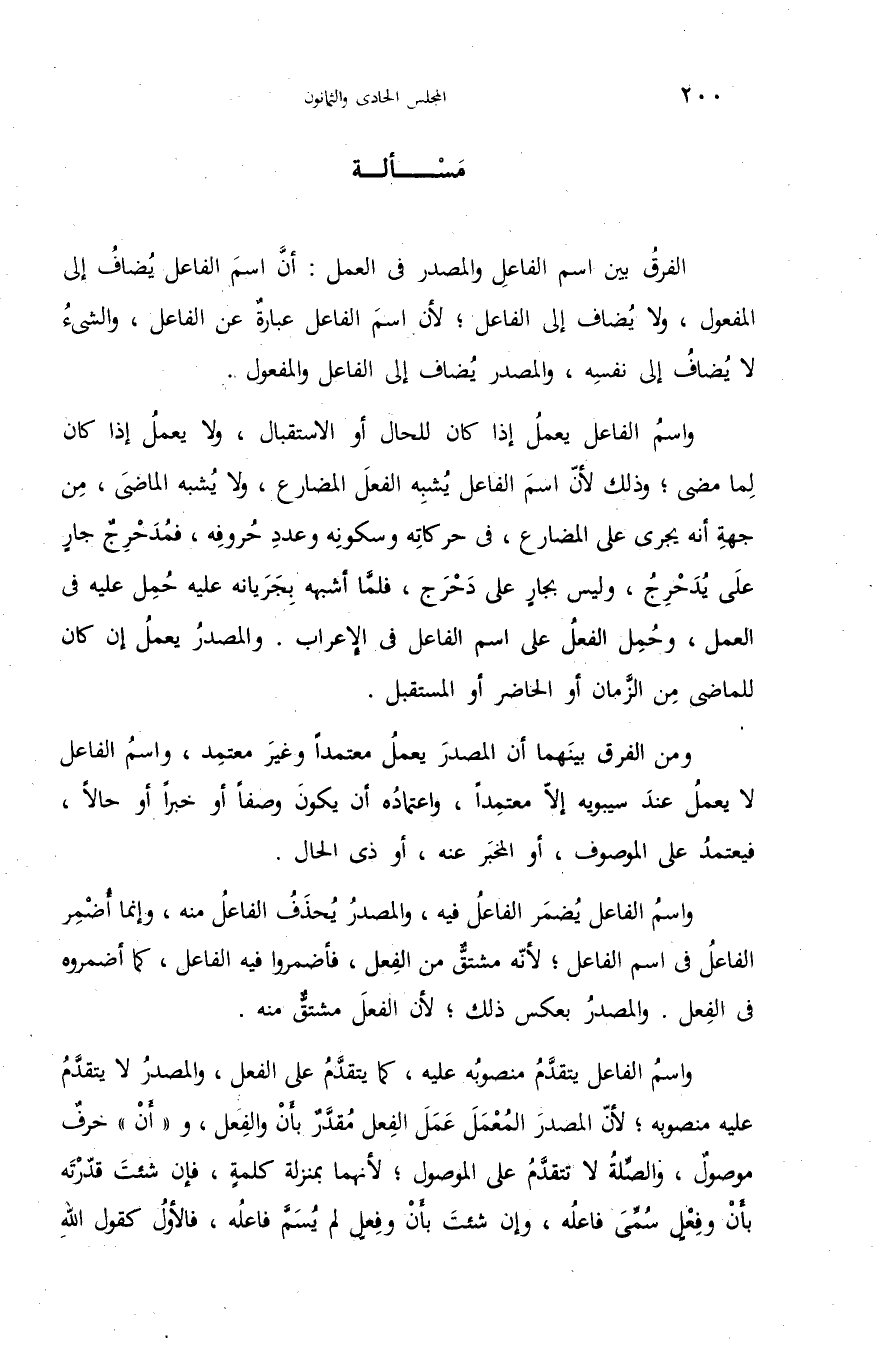 واسم الفاعل يتقدّم منصوبه عليه، كما يتقدّم على الفعل، والمصدر لا يتقدّم عليه منصوبه؛ لأنّ المصدر المعمل عمل الفعل مقدّر بأن والفعل، و «أن» حرف موصول، والصّلة لا تتقدّم على الموصول؛ لأنهما بمنزلة كلمة، فإن شئت قدّرته بأن وفعل سمّى فاعله، وإن شئت بأن وفعل لم يسمّ فاعله، فالأول كقول الله