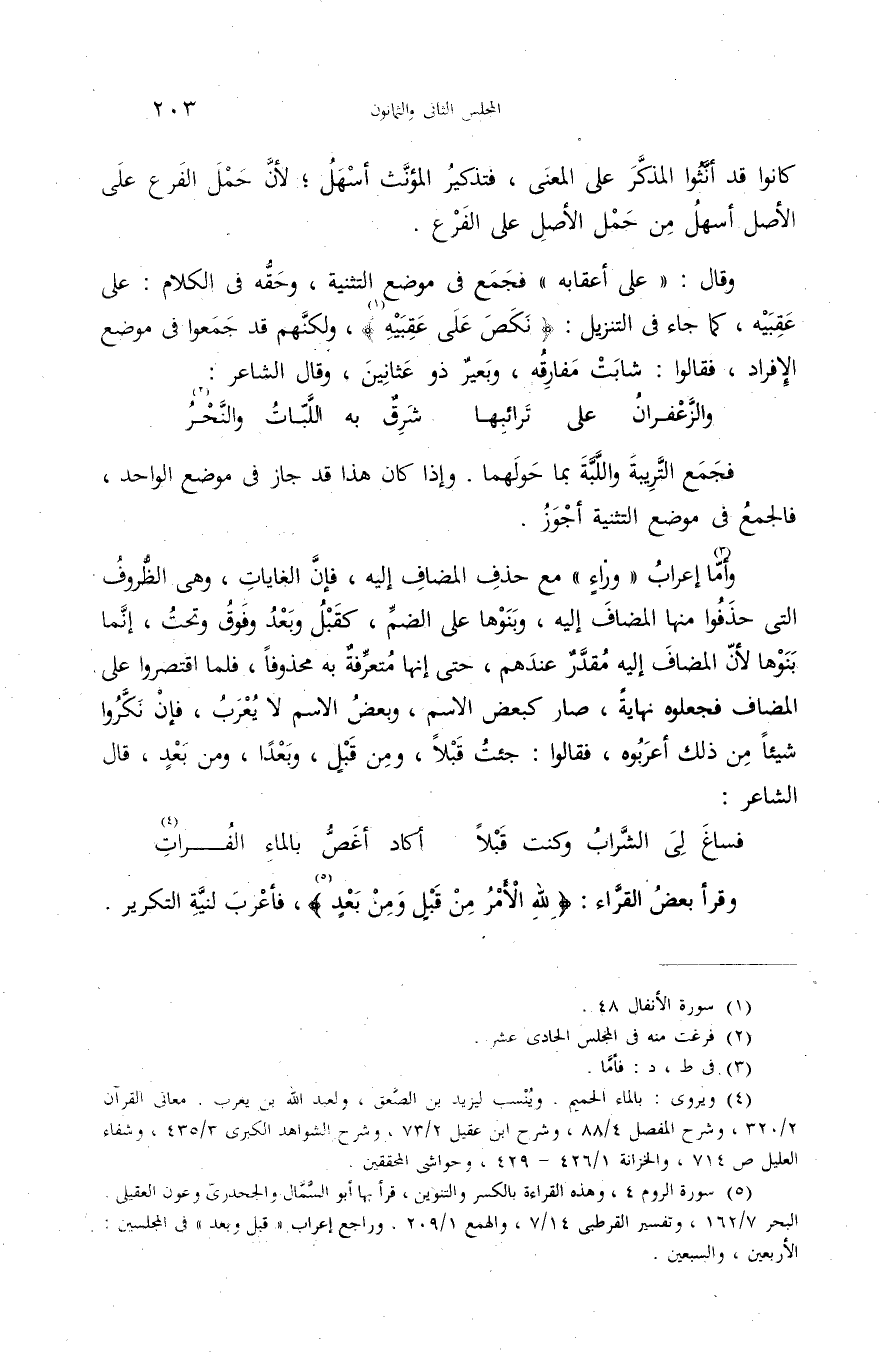 وقال: «على أعقابه» فجمع فى موضع التثنية، وحقّه فى الكلام: على عقبيه، كما جاء فى التنزيل: {نَكَصَ عَلى عَقِبَيْهِ} (¬1)، ولكنّهم قد جمعوا فى موضع الإفراد، فقالوا: شابت مفارقه، وبعير ذو عثانين، وقال الشاعر: