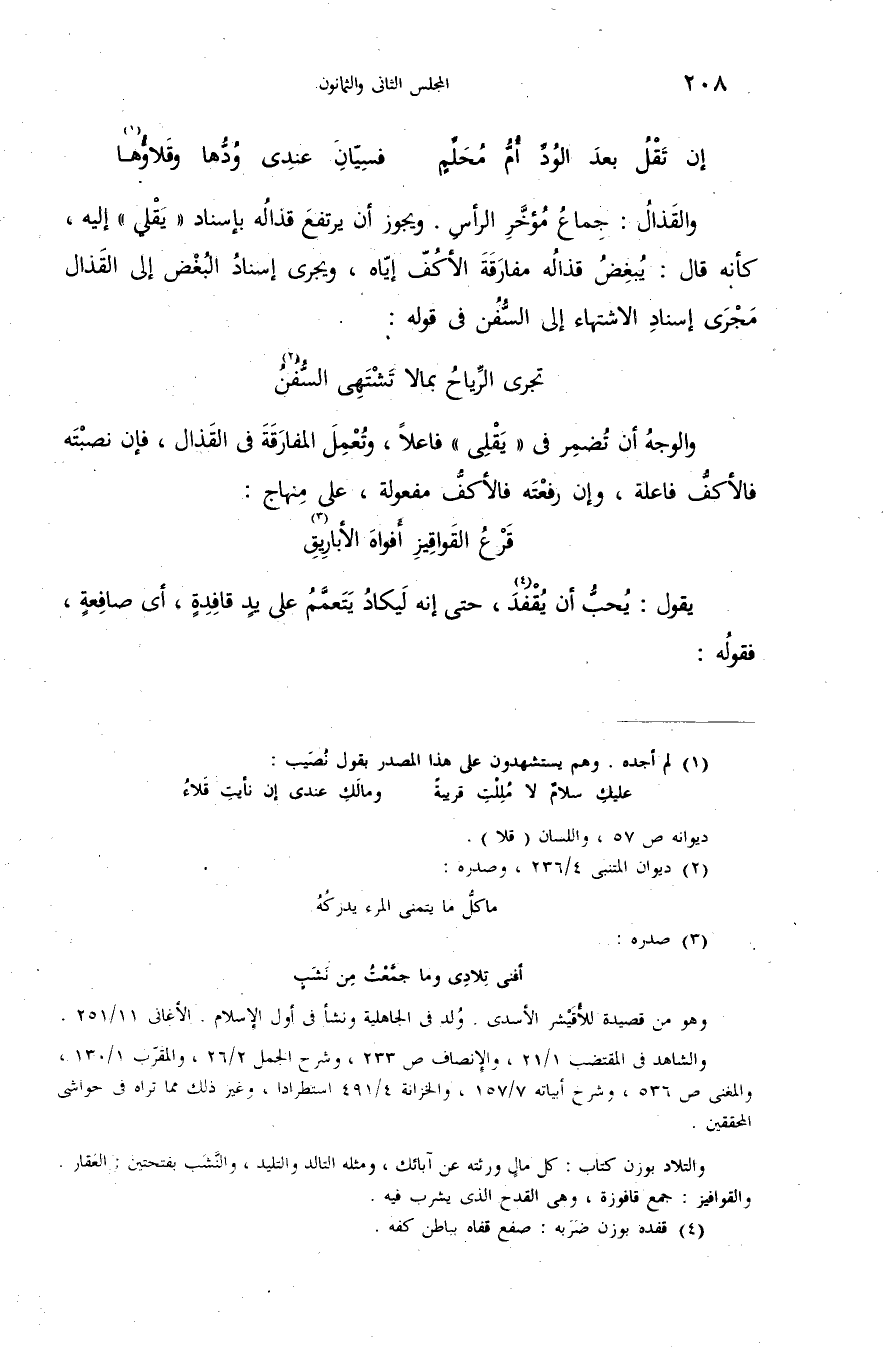 (¬3) صدره: أفنى تلادى وما جمّعت من نشب وهو من قصيدة للأقيشر الأسدى. ولد فى الجاهلية ونشأ فى أول الإسلام. الأغانى 11/ 251. والشاهد فى المقتضب 1/ 21، والإنصاف ص 233، وشرح الجمل 2/ 26، والمقرّب 1/ 130، والمغنى ص 536، وشرح أبياته 7/ 157، والخزانة 4/ 491 استطرادا، وغير ذلك مما تراه فى حواشى المحققين. والتلاد بوزن كتاب: كل مال ورثته عن آبائك، ومثله التالد والتليد، والنّشب بفتحتين: العقار. والقوافيز: جمع قافوزة، وهى القدح الذى يشرب فيه.