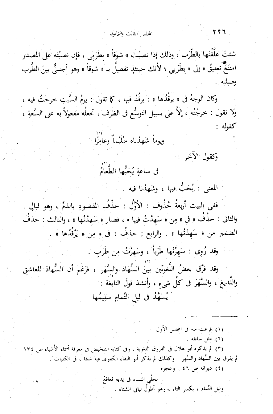والثانى: حذف «فى» من «سهدت فيها»، فصار «سهدتها»، والثالث: حذف الضمير من «سهدتها». والرابع: حذف «فى» من «يرقدها».