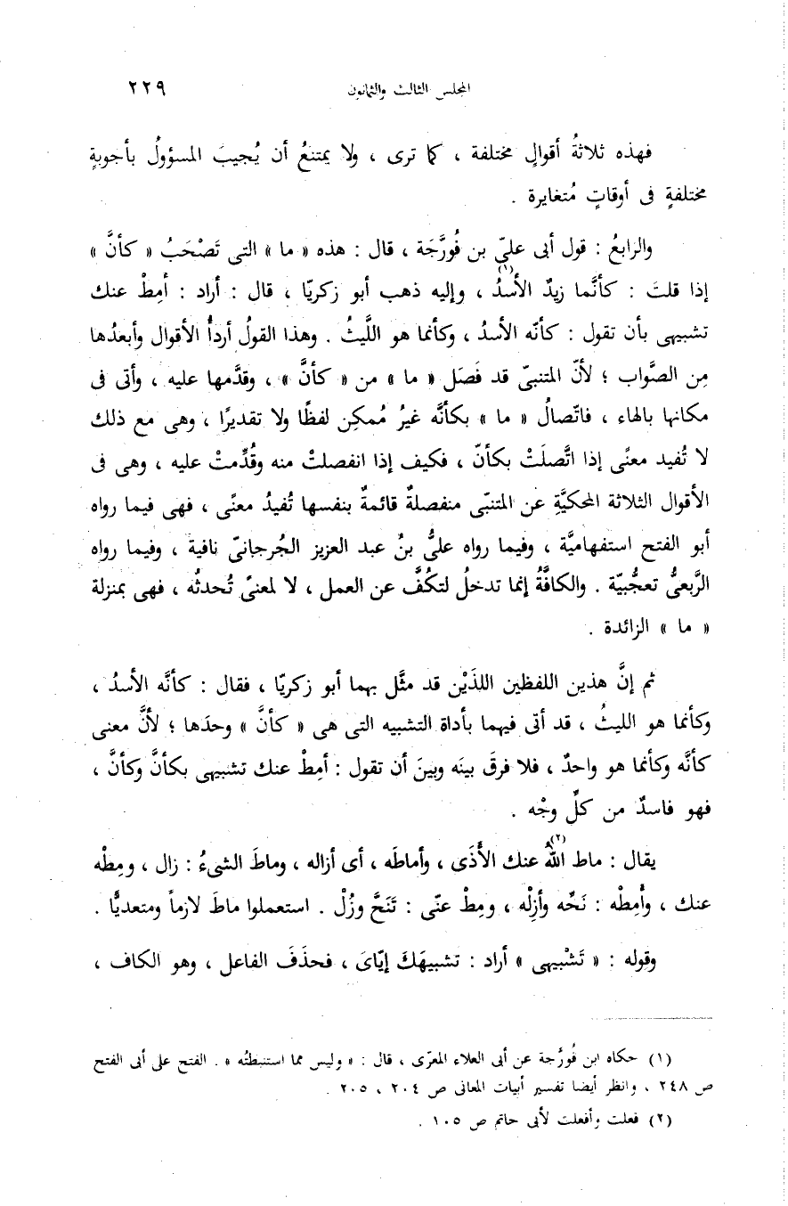 ثم إنّ هذين اللفظين اللذين قد مثّل بهما أبو زكريّا، فقال: كأنّه الأسد، وكأنما هو الليث، قد أتى فيهما بأداة التشبيه التى هى «كأنّ» وحدها؛ لأنّ معنى كأنّه وكأنما هو واحد، فلا فرق بينه وبين أن تقول: أمط عنك تشبيهى بكأنّ وكأنّ، فهو فاسد من كلّ وجه.