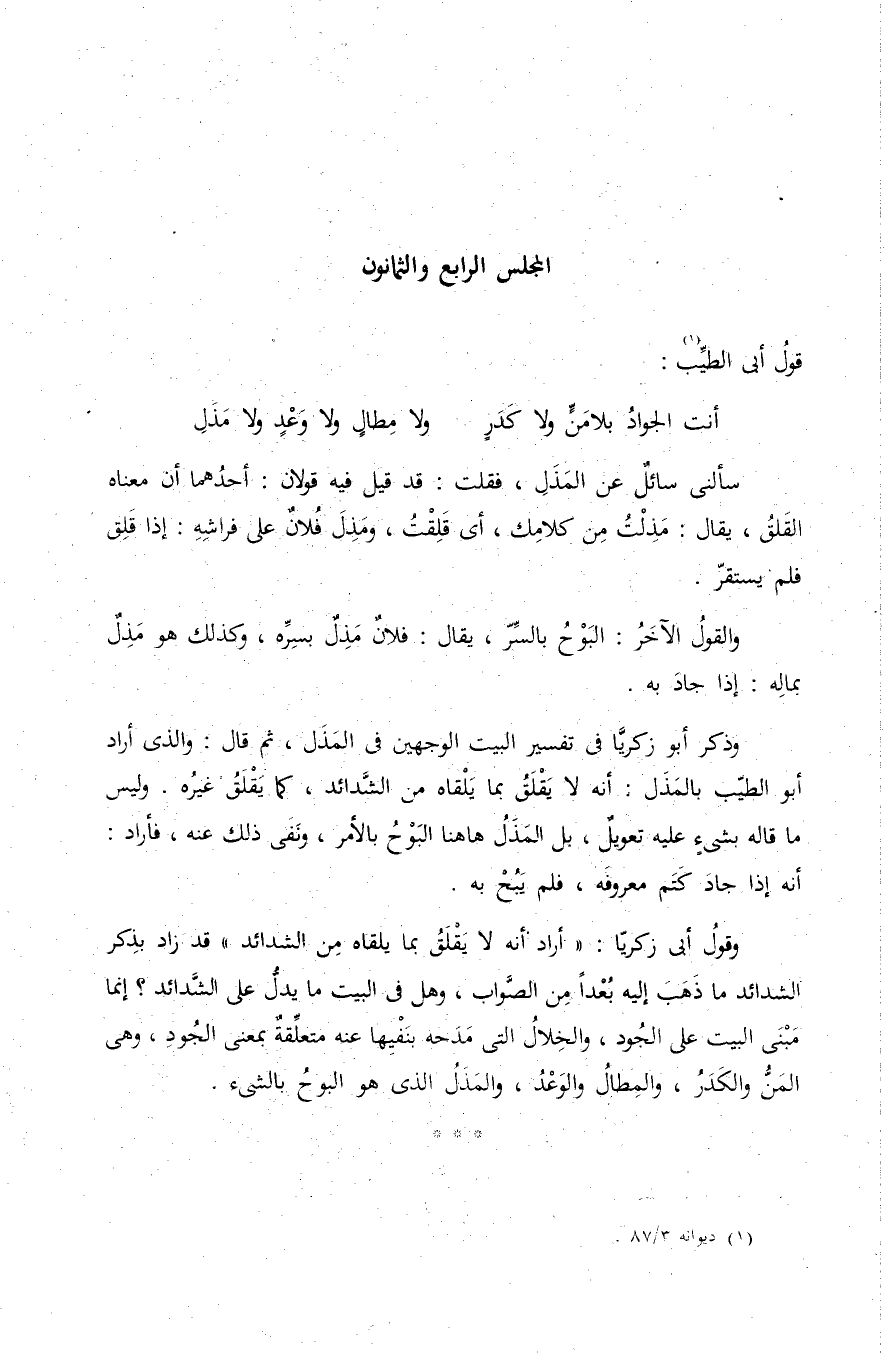 وذكر أبو زكريّا فى تفسير البيت الوجهين فى المذل، ثم قال: والذى أراد أبو الطيّب بالمذل: أنه لا يقلق بما يلقاه من الشّدائد، كما يقلق غيره. وليس ما قاله بشىء عليه تعويل، بل المذل هاهنا البوح بالأمر، ونفى ذلك عنه، فأراد: