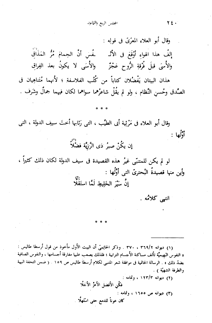 ... وقال أبو العلاء فى مرثية أبى الطيّب، التى رثا بها أخت سيف الدولة، التى أوّلها: