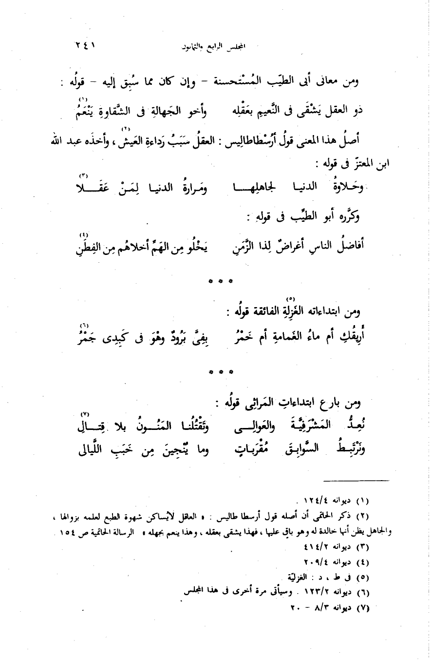 (¬2) ذكر الحاتمى أن أصله قول أرسطاطاليس: «العاقل لا يساكن شهوة الطبع لعلمه بزوالها، والجاهل يظن أنها خالدة له وهو باق عليها، فهذا يشقى بعقله، وهذا ينعم بجهله». الرسالة الحاتمية ص 154.