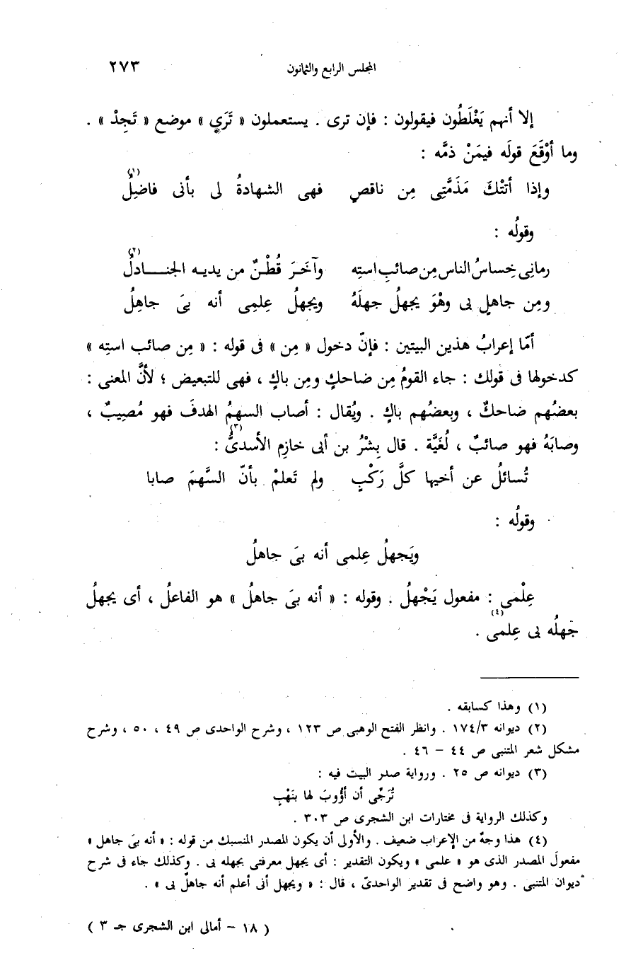 (¬4) هذا وجه من الإعراب ضعيف. والأولى أن يكون المصدر المنسبك من قوله: «أنه بى جاهل» مفعول المصدر الذى هو «علمى» ويكون التقدير: أى يجهل معرفتى بجهله بى. وكذلك جاء فى شرح ديوان المتنبى. وهو واضح فى تقدير الواحدىّ، قال: «ويجهل أنى أعلم أنه جاهل بى».