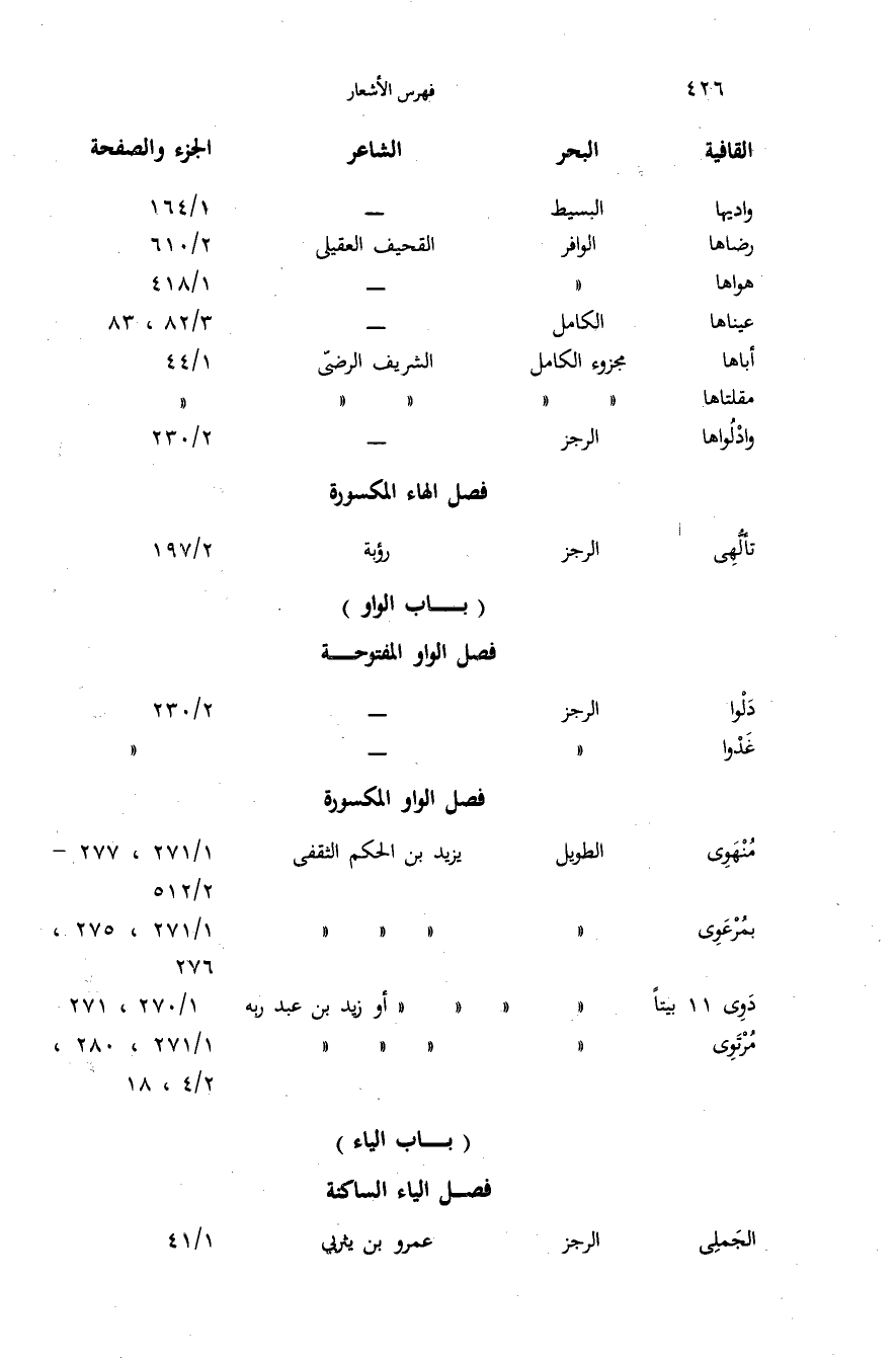 مرتوى \الطويل \يزيد بن الحكم الثقفى أو زيد بن عبد ربه \1/ 271،280، 2/ 4،18