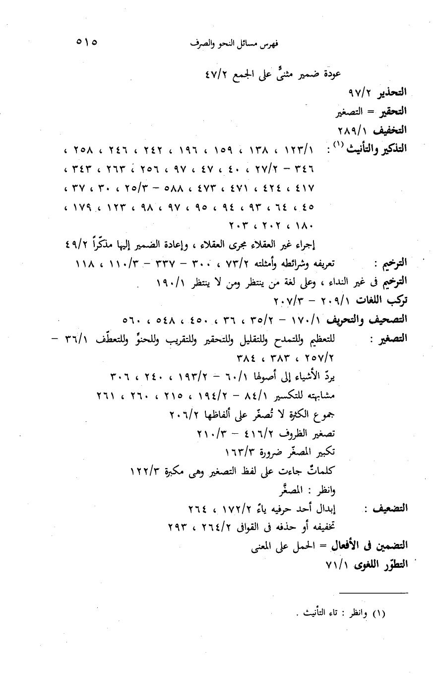 التذكير والتأنيث (¬1):1/ 123،138،159،196،242،246،258، 346 - 2/ 27،40،47،97،256،263،343، 417،424،471،473،588 - 3/ 25،30،37، 45،64،93،94،95،97،98،123،179، 180،202،203