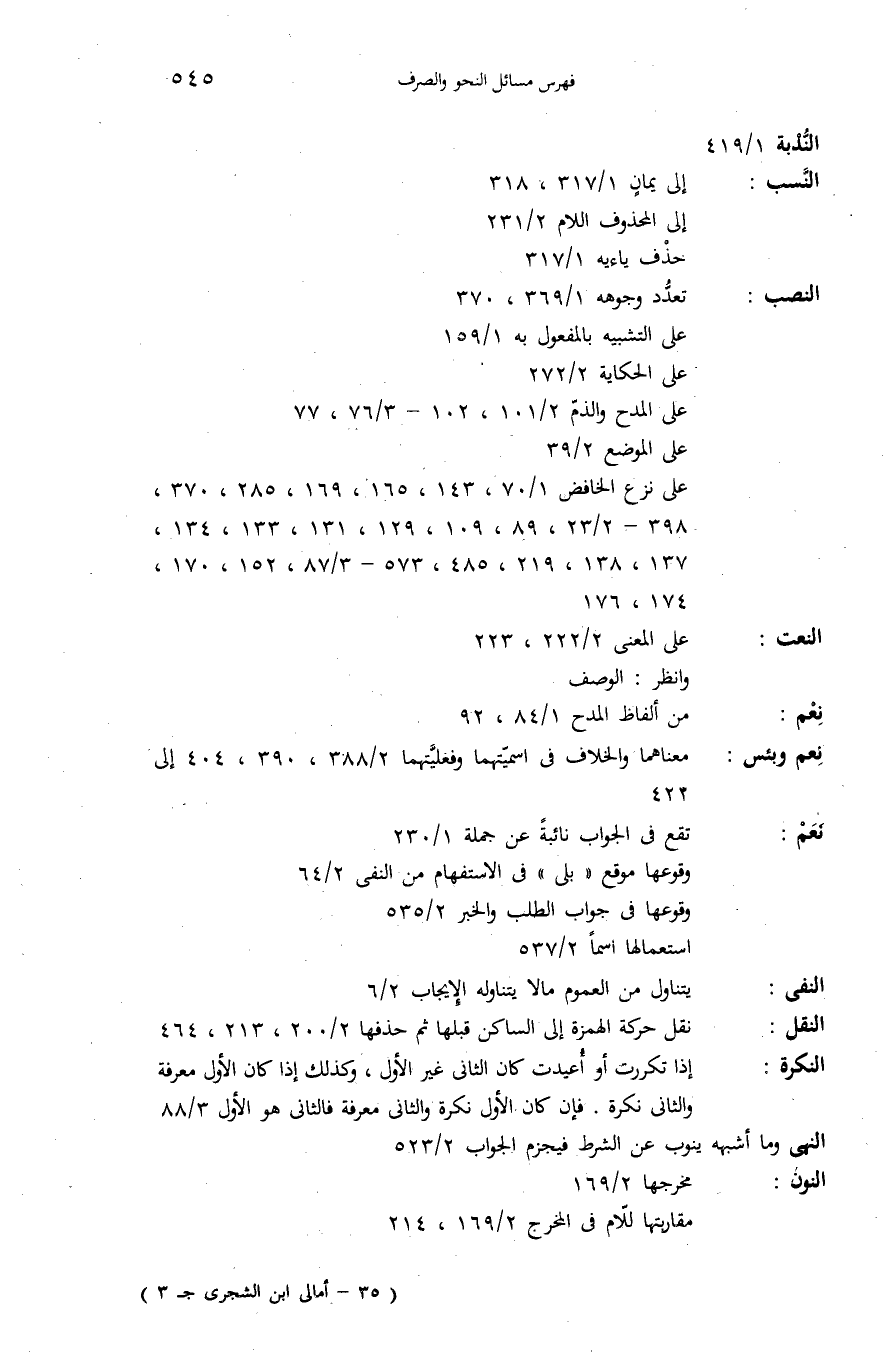 على نزع الخافض 1/ 70،143،165،169،285،370، 398 - 2/ 23،89،109،129،131،133،134، 137،138،219،485،573 - 3/ 87،152،170، 174،176