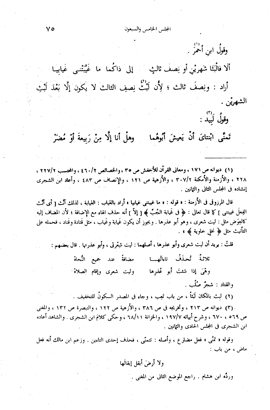 (¬3) ديوانه ص 213، وتخريجه فى ص 386، والأزهية ص 122، والتبصرة ص 132، والمغنى ص 569،670، وشرح أبياته 7/ 197، والخزانة 11/ 68، وحكى كلام ابن الشجرى. والشاهد أعاده ابن الشجرى فى المجلس الحادى والثمانين. وقوله «تمنّى» فعل مضارع، وأصله: تتمنّى، فحذف إحدى التاءين. وزعم ابن مالك أنه فعل ماض، من باب: ولا أرض أبقل إبقالها وردّه ابن هشام. راجع الموضع الثانى من المغنى.