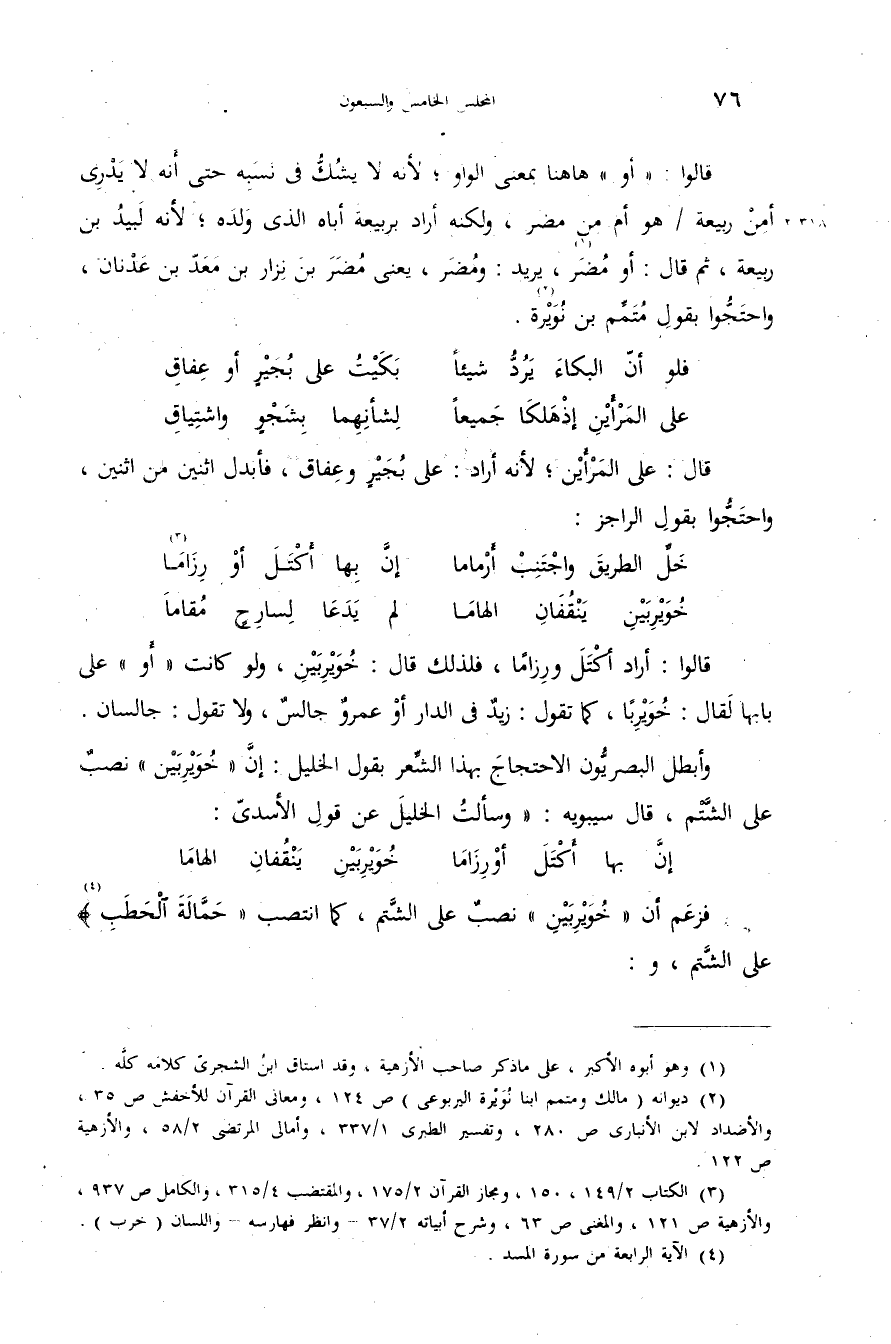 فزعم أن «خويربين» نصب على الشّتم، كما انتصب «{حَمّالَةَ الْحَطَبِ} (¬4) على الشّتم، و: