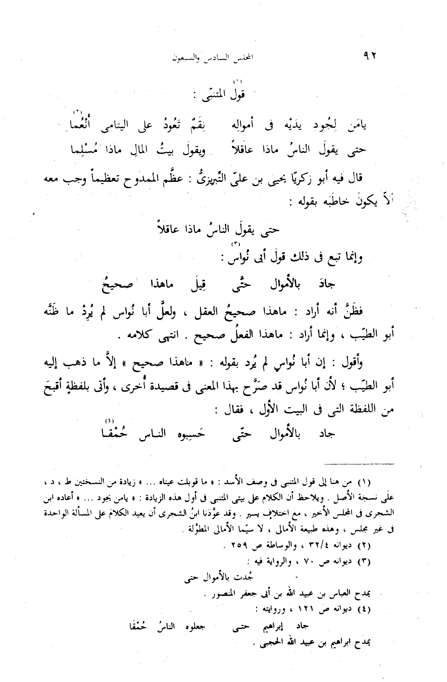 (¬1) من هنا إلى قول المتنبى فى وصف الأسد: «ما قوبلت عيناه. . .» زيادة من النسختين ط، د، على نسخة الأصل. ويلاحظ أن الكلام على بيتى المتنبى فى أول هذه الزيادة: «يا من يجود. . .» أعاده ابن الشجرى فى المجلس الأخير، مع اختلاف يسير. وقد عوّدنا ابن الشجرى أن يعيد الكلام على المسألة الواحدة فى غير مجلس، وهذه طبيعة الأمالى، لا سيّما الأمالى المطوّلة.