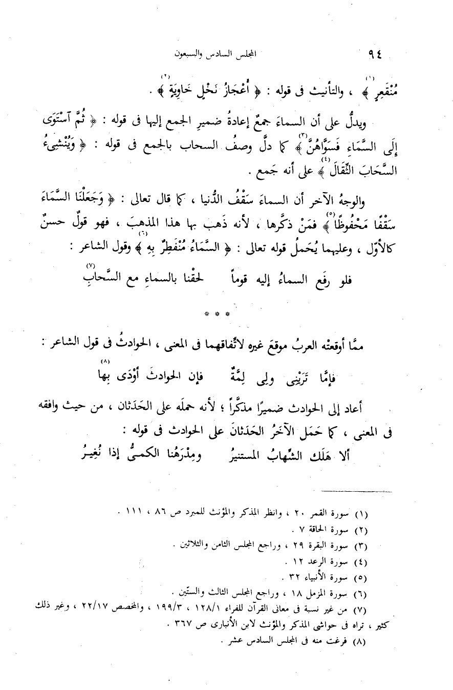 (¬1) سورة القمر 20، وانظر المذكر والمؤنث للمبرد ص 86،111.