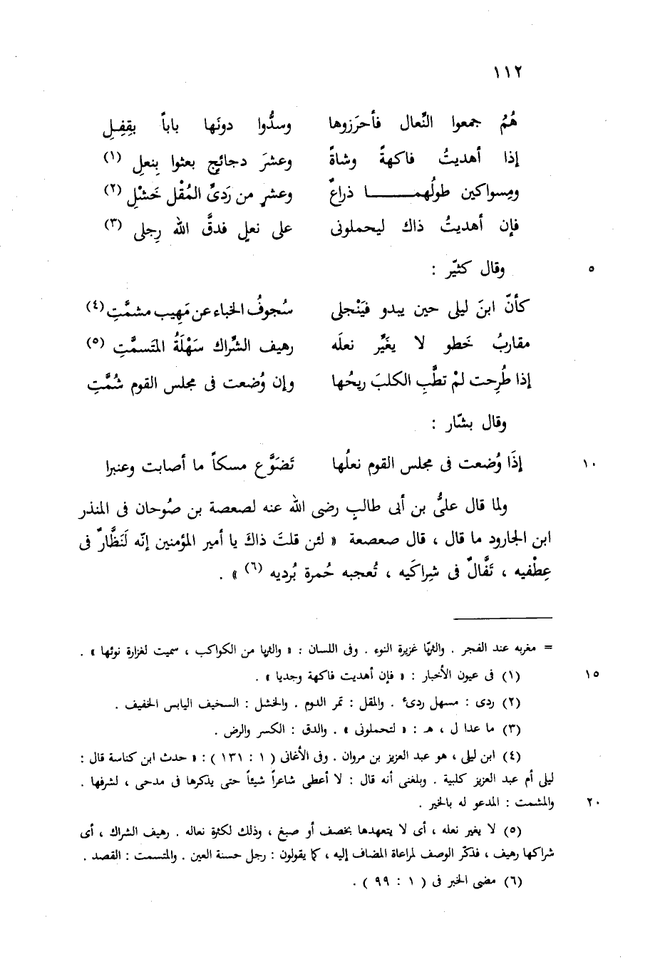 ولما قال علي بن أبي طالب رضي الله تعالى عنه لصعصعة بن صوحان في المنذر بن الجارود ما قال قال صعصعة يا أمير المؤمنين لئن قلت ذاك انه لنظار في عطفيه تفال في شراكية تعجبه حمرة برديه@